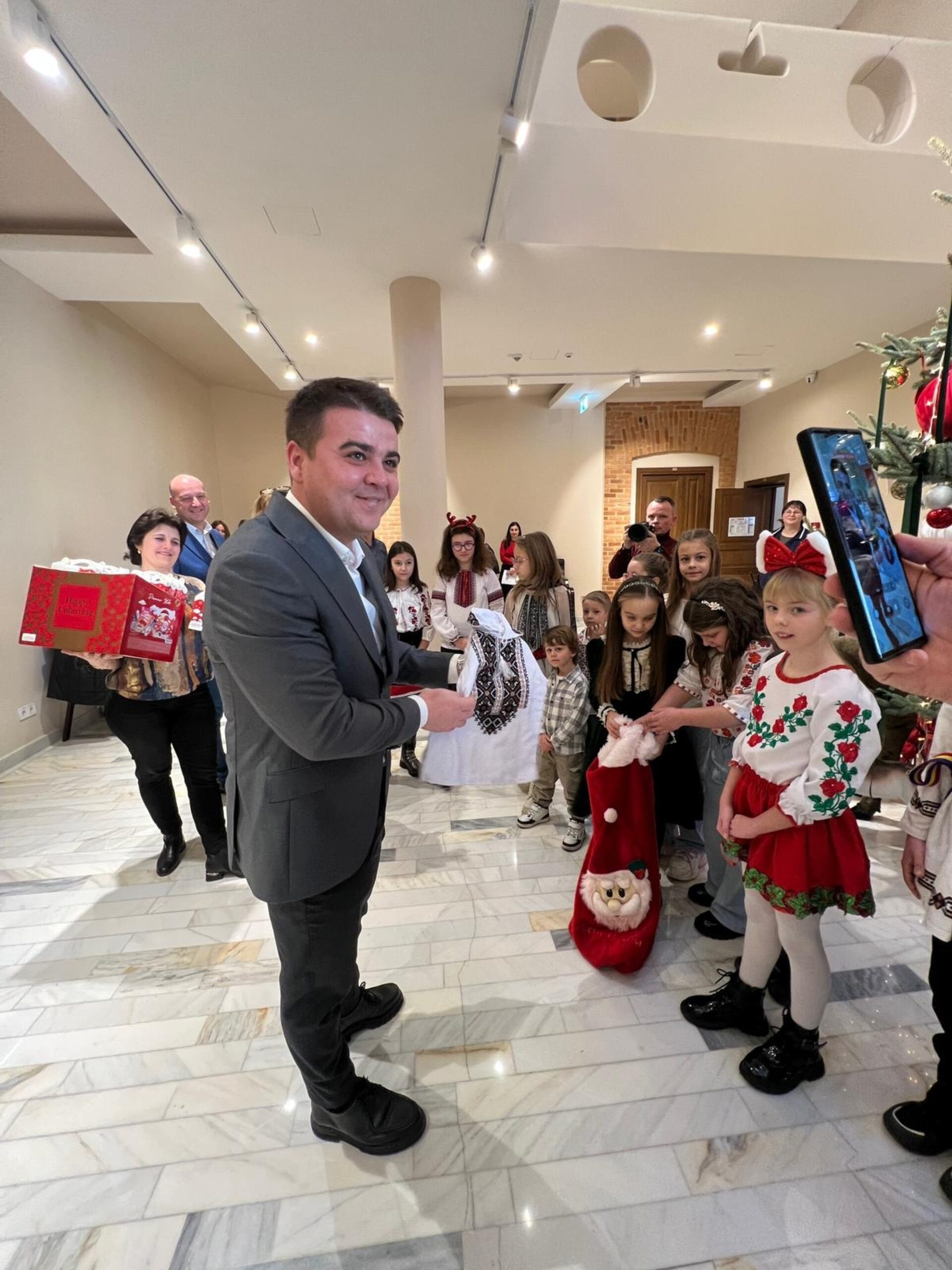 Elevii clasei a III-a C de la Școala Gimnazială „Ion Creangă” Suceava au oferit o ie tradițională fiului președintelui Consiliului Județean (CJ) Suceava, Gheorghe Șoldan, la finalul unui program de colinde pe care școlarii l-au avut la sediul instituției.