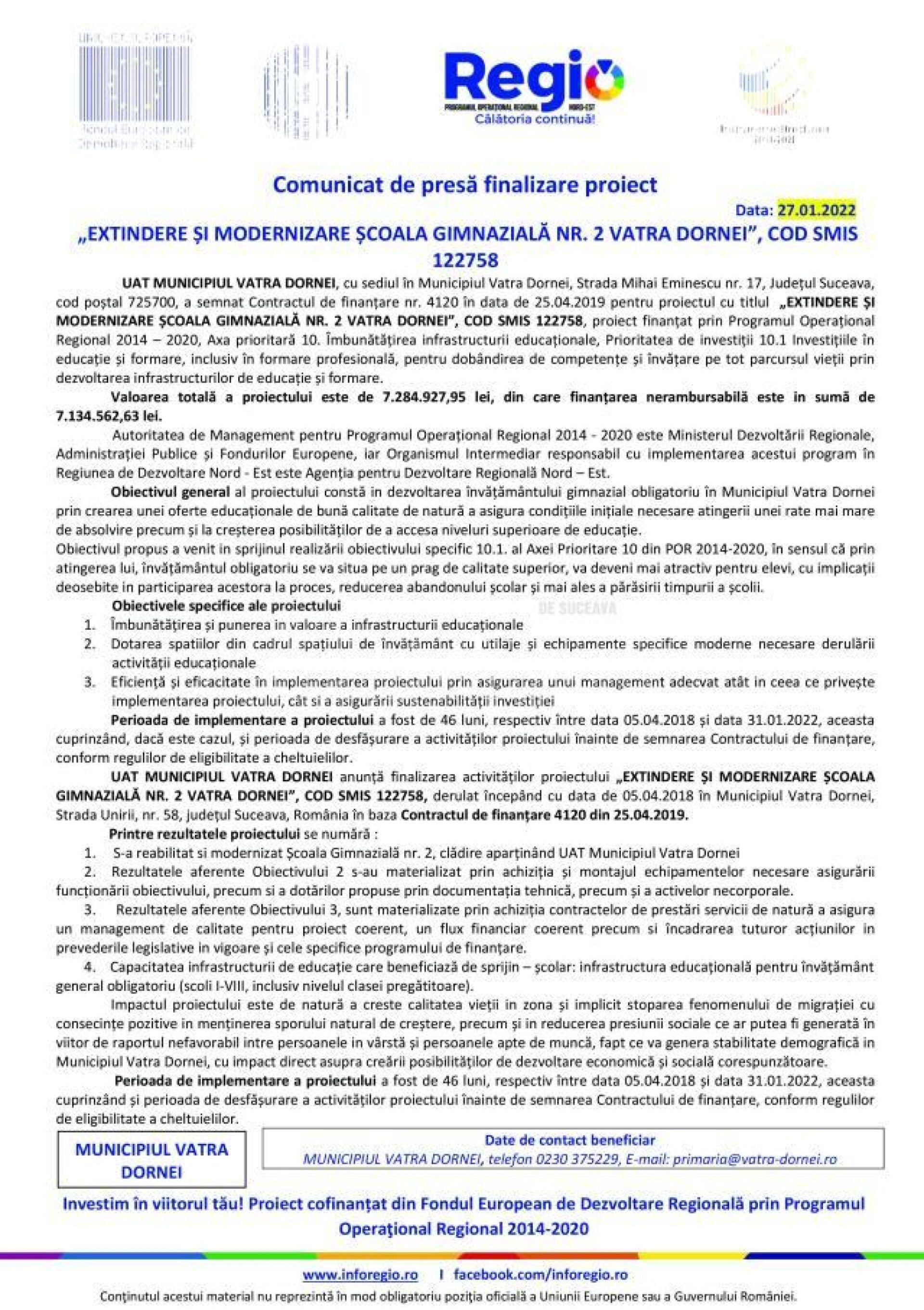 UAT MUNICIPIUL VATRA DORNEI, cu sediul în Municipiul Vatra Dornei, Strada Mihai Eminescu nr. 17, Județul Suceava, cod poștal 725700, a semnat Contractul de finanțare nr. 4120 în data de 25.04.2019 pentru proiectul cu titlul „EXTINDERE ȘI MODERNIZARE ȘCOALA GIMNAZIALĂ NR. 2 VATRA DORNEI”, COD SMIS 122758, proiect finanțat prin Programul Operațional Regional 2014 – 2020, Axa prioritară 10. Îmbunătățirea infrastructurii educaționale, Prioritatea de investiții 10.1 Investițiile în educație și formare, inclusiv în formare profesională, pentru dobândirea de competențe și învățare pe tot parcursul vieții prin dezvoltarea infrastructurilor de educație și formare.