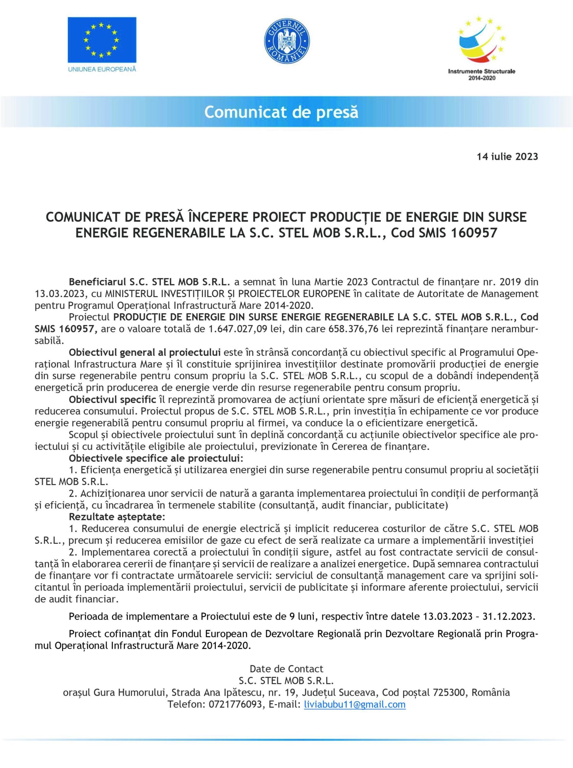 COMUNICAT DE PRESĂ ÎNCEPERE PROIECT PRODUCȚIE DE ENERGIE DIN SURSE ENERGIE REGENERABILE LA S.C. STEL MOB S.R.L., Cod SMIS 160957