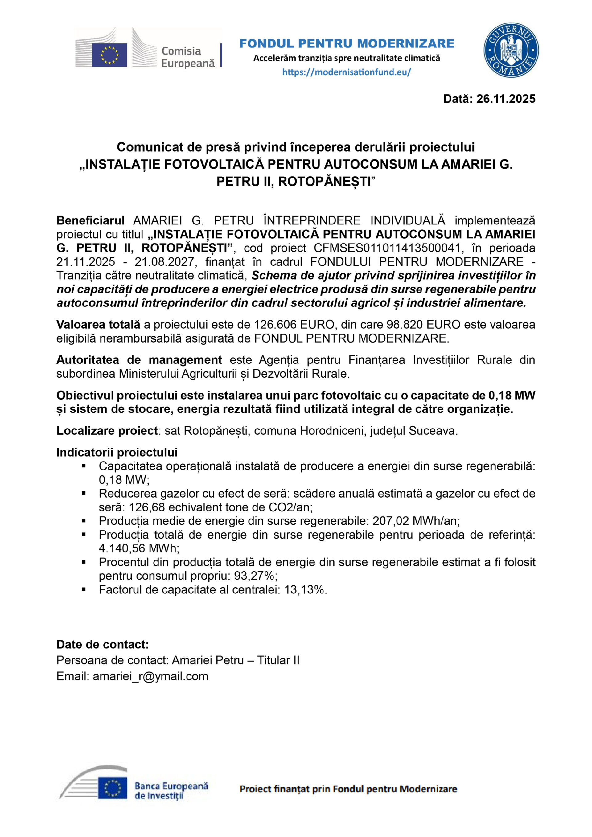 Beneficiarul AMARIEI G. PETRU ÎNTREPRINDERE INDIVIDUALĂ implementează proiectul cu titlul „INSTALAȚIE FOTOVOLTAICĂ PENTRU AUTOCONSUM LA AMARIEI G. PETRU II, ROTOPĂNEȘTI”, cod proiect CFMSES011011413500041, în perioada 21.11.2025 – 21.08.2027, finanțat în cadrul FONDULUI PENTRU MODERNIZARE – Tranziția către neutralitate climatică, Schema de ajutor privind sprijinirea investițiilor în noi capacități de producere a energiei electrice produsă din surse regenerabile pentru autoconsumul întreprinderilor din cadrul sectorului agricol și industriei alimentare.