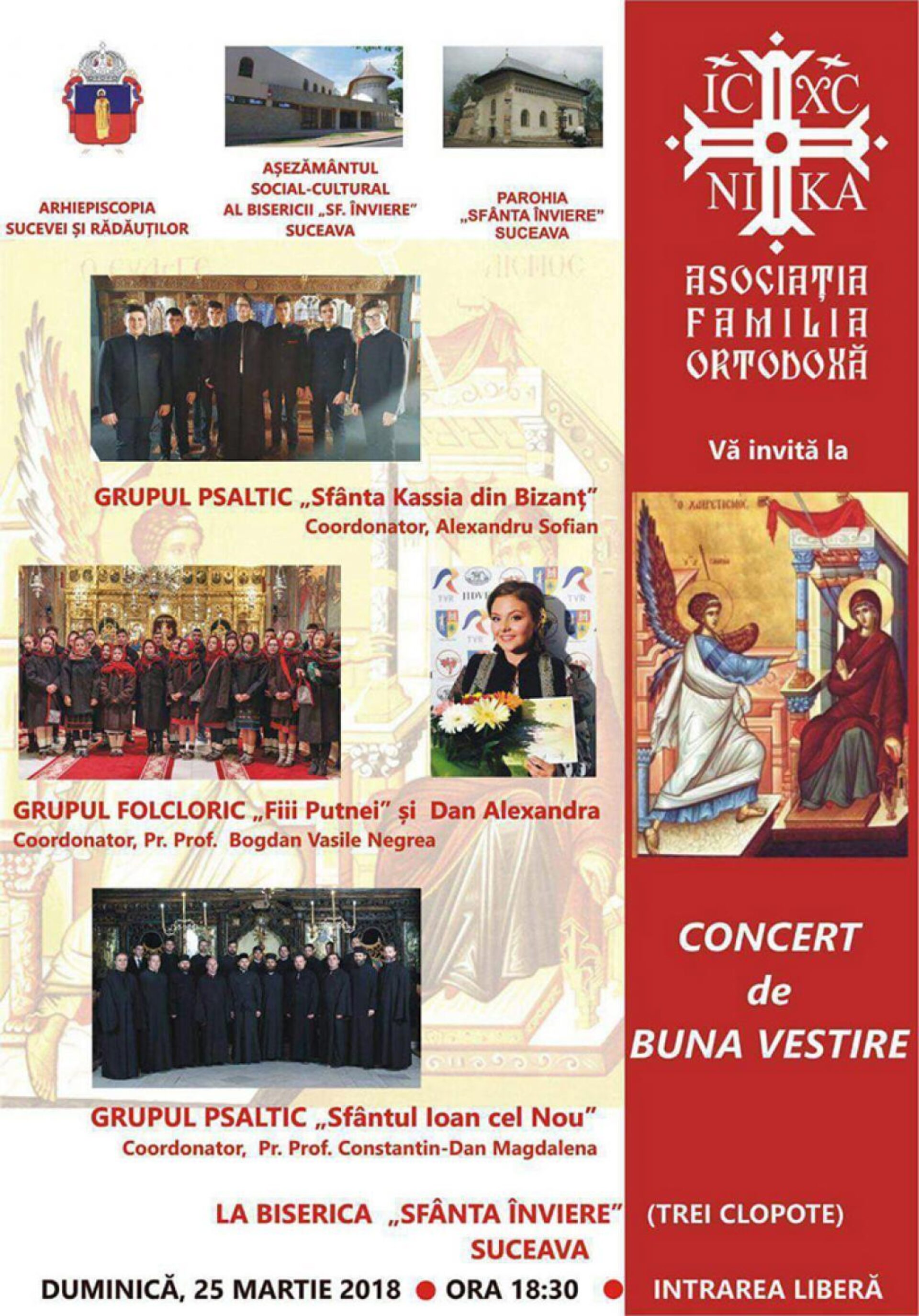 Arhiepiscopia Sucevei și Rădăuților, Așezământul Social-Cultural al Bisericii ”Sf. Înviere” Suceava, Parohia ”Sf. Înviere” Suceava și Asociația Familia Ortodoxă organizează duminică, 25 martie, de la ora 18:30, la Biserica ”Sf. Înviere” (Trei Clopote) Suceava, un Concert de Buna Vestire, la care intrarea este liberă. Vor evolua Grupul Psaltic ”Sfânta Kassia din Bizanț”, coordonator Alexandru Sofian, Grupul Folcloric ”Fiii Putnei” și Dan Alexandra, coordonator pr. prof. Bogdan Vasile Negrea, și Grupul Psaltic ”Sf. Ioan cel Nou”, coordonator pr. prof. Constantin-Dan Magdalena.