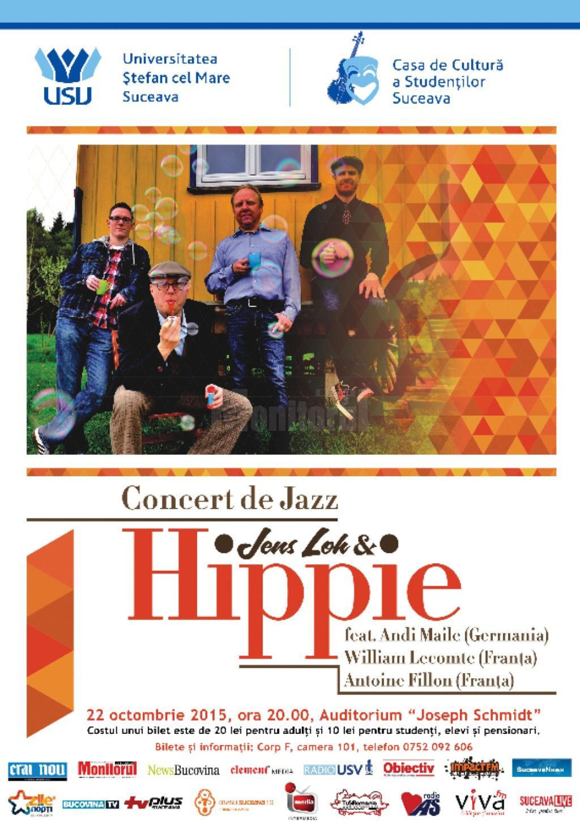 Joi, 22 octombrie, de la ora 20, în Auditoriumul „Joseph Schmidt”, Casa de Cultură a Studenților din cadrul Universității „Ștefan cel Mare” din Suceava va organiza un concert extraordinar de jazz. Este vorba despre formația Hippie, care transformă jazzul în rock și rockul în jazz. Prețul unui bilet la spectacol este de 20 lei pentru adulți și 10 lei pentru elevi și studenți. Biletele se pot achiziționa între orele 10:00-16:00, la camera 101, din corpul F al Universității „Ștefan cel Mare” Suceava, sau la intrarea în Auditoriumul „Joseph Schmidt”, înaintea spectacolului. Informații și rezervări la telefonul: 0752 092 606.Potrivit organizatorilor, „acest cvartet adaugă compozițiilor sale ritmuri cajun, soul și funk, iar când Andi Maile (saxofon) schimbă ritmul de la ceva alert la pasaje parcă evanghelice, rezultă ceva divin. Când nu interpretează compozițiile proprii ale lui Jens Loh, cei patru cântă piese de mult timp uitate care, din acest motiv, sunt considerate melodii rock clasice: a lui Queen sau a lui Janis Joplin ș. a. Sloganul lor este: ”. Componență: Jens Loh (Germania) – chitară bas, Antoine Fillon (Franța) – tobe, Andi Maile (Germania) – saxofon și William Lecomte (Franța) – orgă.