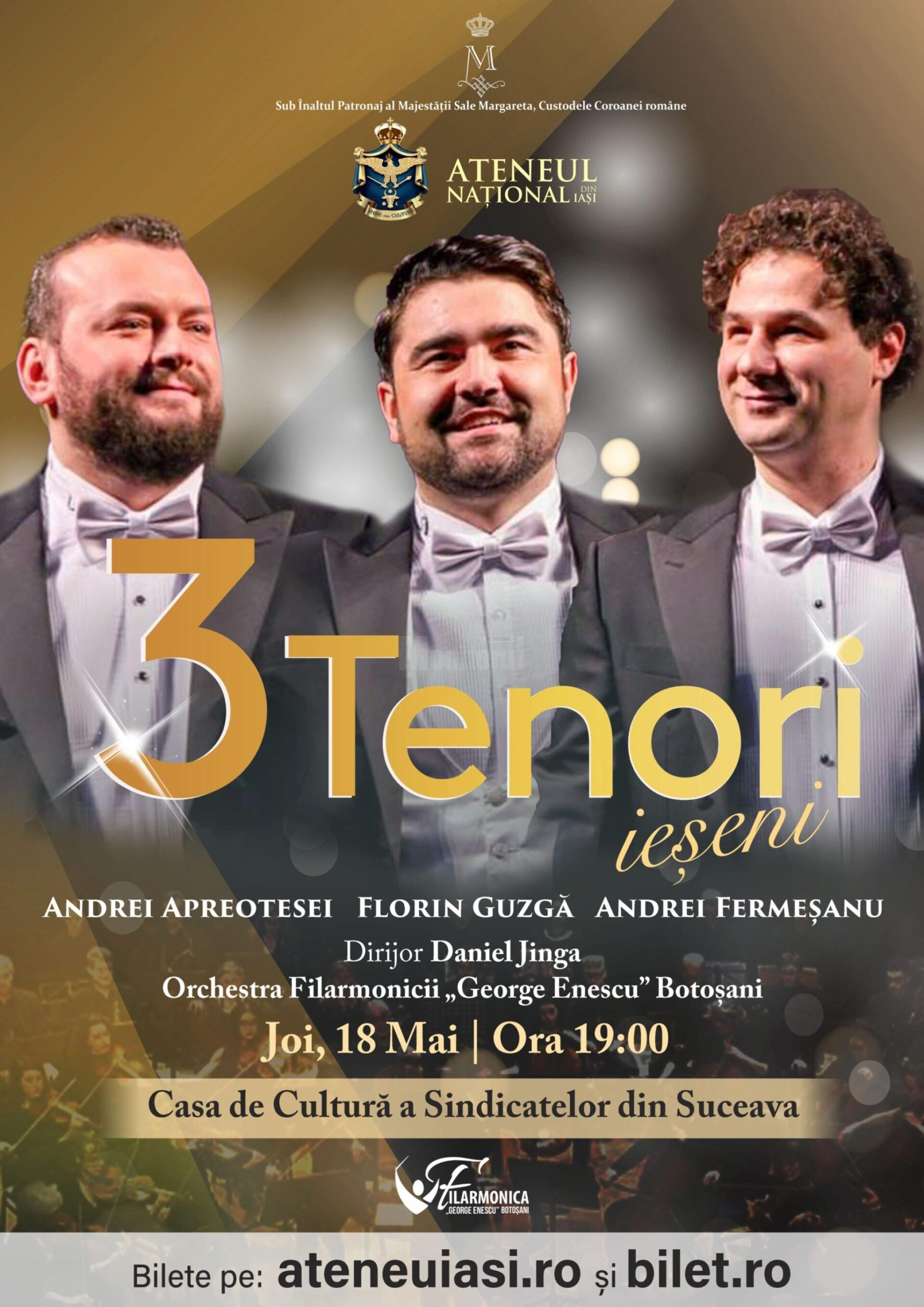 Pe scena Casei de Cultură a Sindicatelor Suceava va avea loc joi, 18 mai 2023, de la ora 19:00, un concert extraordinar susținut de trei tenori ieșeni: Andrei Apreotesei, Andrei Fermeșanu și Felix Guzgă.