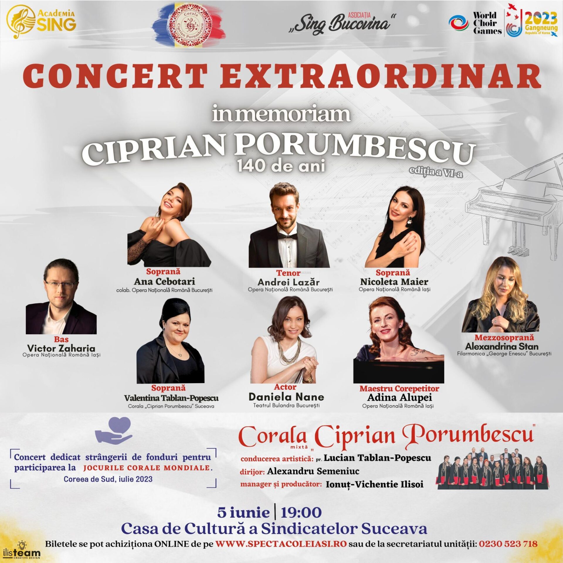 Pe scena Casei de Cultură a Sindicatelor Suceava va avea loc luni, 5 iunie 2023, de la ora 19:00, Concertul extraordinar In memoriam „Ciprian Porumbescu” – 140 de ani” – concert caritabil de strângere de fonduri – organizat de Corala „Ciprian Porumbescu” și Asociația „Sing Bucovina” din Suceava.