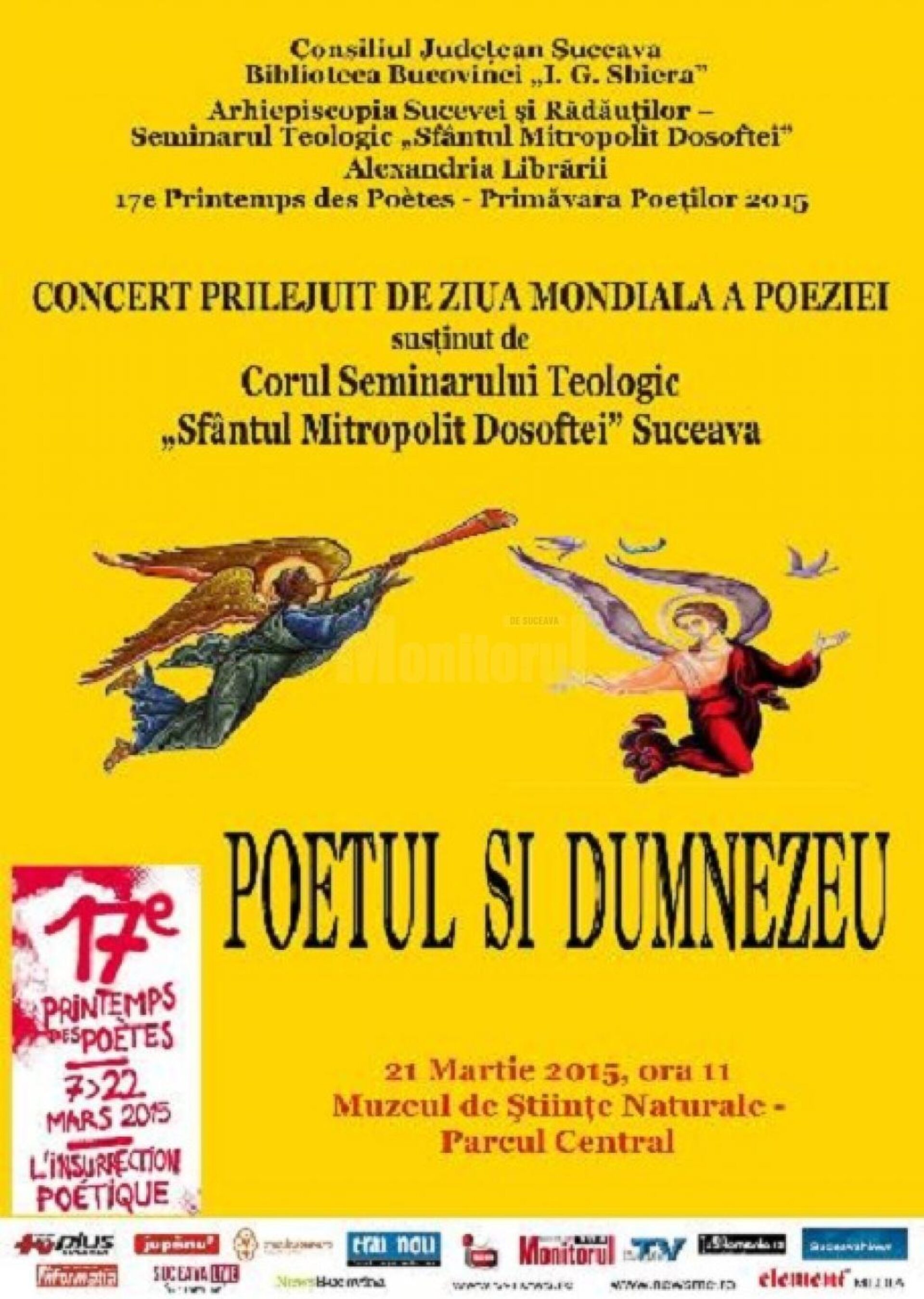 Corul Seminarului Teologic „Sfântul Mitropolit Dosoftei” Suceava va susține sâmbătă, 21 martie a.c., la ora 11.00, la Muzeul de Științele Naturii din municipiul Suceava, un concert cu genericul „Poetul și Dumnezeu”, prilejuit de Ziua Mondială a Poeziei. Concertul, organizat sub egida Consiliului Județean Suceava și a Arhiepiscopiei Sucevei și Rădăuților, se circumscrie celei de-a XVII-a ediții a Festivalului „Primăvara Poeților”.