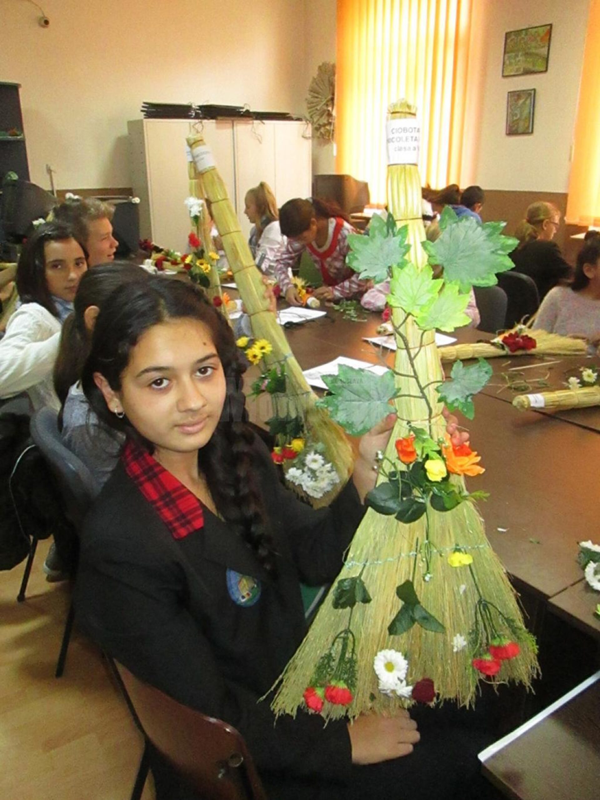 La rândul lor, elevii au decorat măturile de sorg cu flori artificiale, flori uscate, insecte, lilieci, dovleci creați de ei din deșeuri textile, deșeuri puse la dispoziție de partenerul eco-școală, GEC Bucovina.