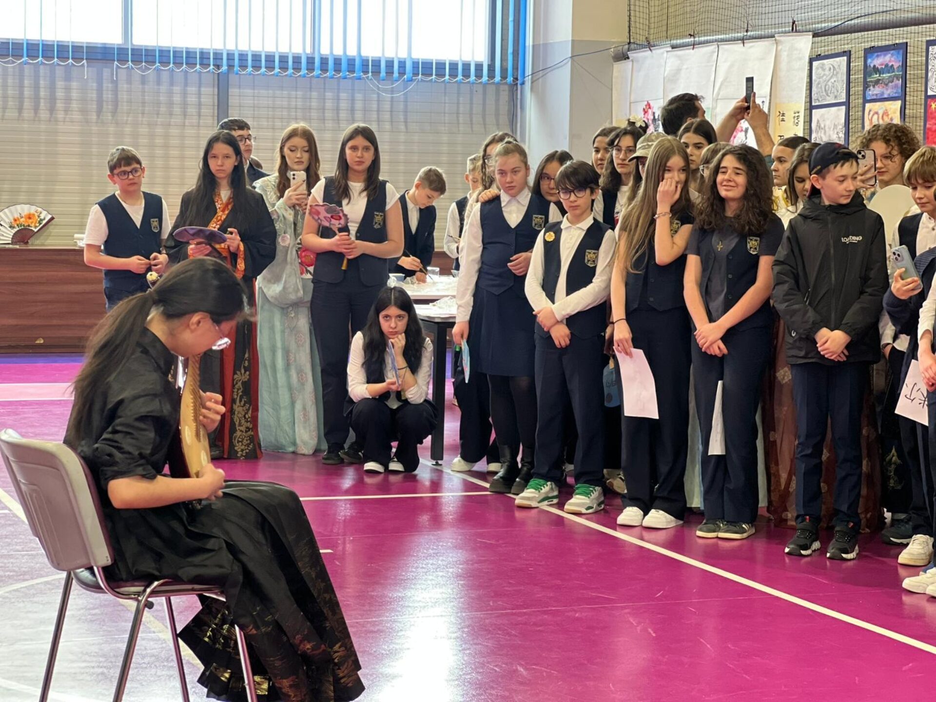 Profesorii de limba chineză au oferit momente artistice, inclusiv interpretări la instrumentul liuqin și dansuri cu evantai.
