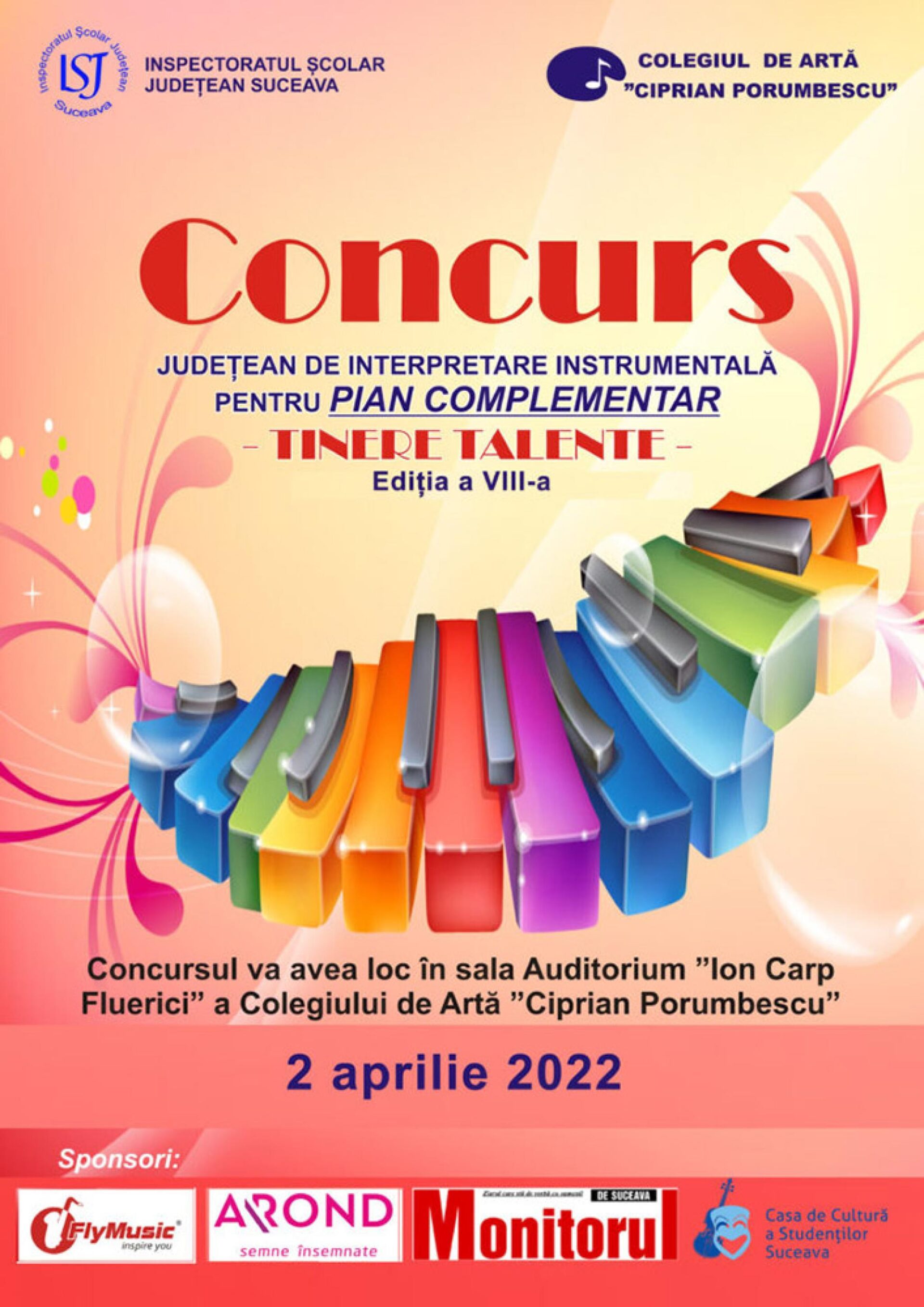 Colegiul de Artă ”Ciprian Porumbescu”, împreună cu Inspectoratul Școlar Județean Suceava, organizează, pe data de 2 aprilie 2022, Concursul de Interpretare Instrumentală pentru Pian Complementar ”Tinere Talente”, ediția a VIII-a.