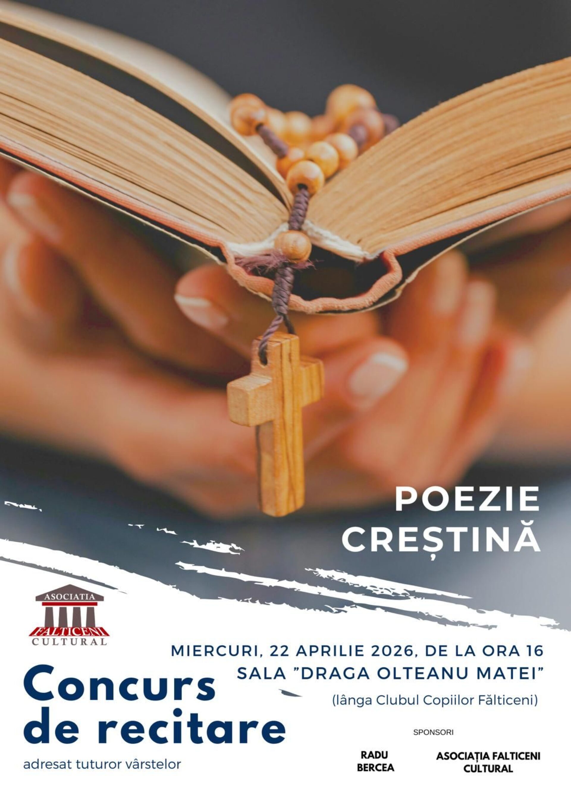 Participanții pot recita la alegere din lirica religioasă creștină. Concursul este adresat tuturor vârstelor, având premii asigurate de Asociația Fălticeni Cultural. Înscrierile se vor face la fața locului, cu 30 de minute înainte de desfășurarea competiției. Sponsori: Radu Bercea și Asociația Fălticeni Cultural. Relații suplimentare la telefon: 0743 102 992.