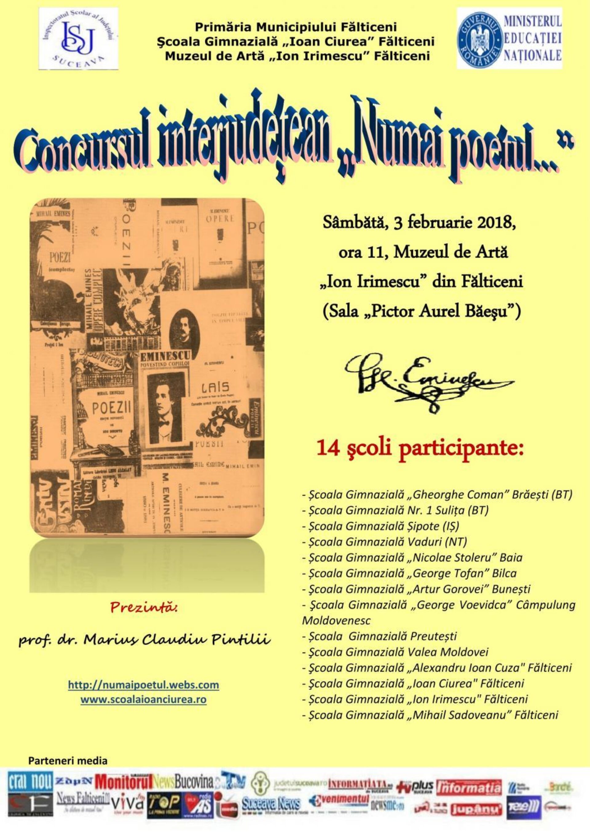 Sâmbătă, 3 februarie, începând cu ora 11.00, Școala Gimnazială „Ioan Ciurea” Fălticeni organizează, în parteneriat cu Primăria Municipiului Fălticeni și cu Muzeul de Artă „Ion Irimescu” Fălticeni, Concursul interjudețean cultural-artistic „Numai poetul…”. Potrivit lui prof. dr. Marius Pintilii, director la Școala Gimnazială „Ioan Ciurea” Fălticeni, acest proiect urmărește revitalizarea receptării poeziei și a personalității lui Mihai Eminescu de către elevii din ciclul gimnazial.