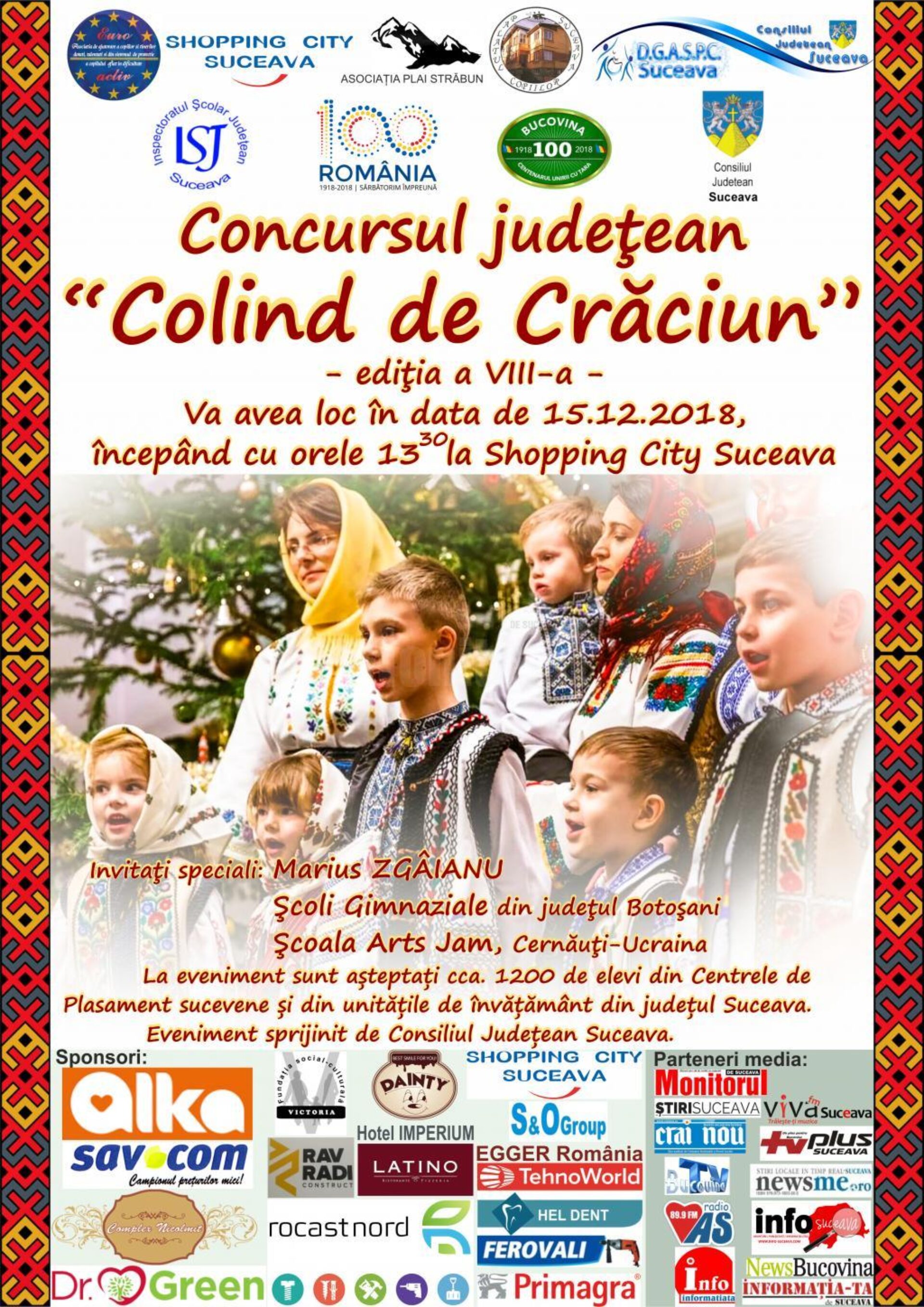 Asociația de ajutorare a copiilor și tinerilor dotați, talentați și din sistemul de protecție a copilului aflat în dificultate „EUROACTIV” Suceava, Shopping City Suceava, Asociația ”Plai Străbun”, în colaborare cu Inspectoratul Școlar Județean Suceava, Palatul Copiilor Suceava, Direcția Generală de Asistență Socială și Protecția Copilului – Suceava, organizează cea de-a 8-a ediție a Concursului județean „Colind de Crăciun” eveniment în asociere cu Consiliul Județean Suceava, unde și-au confirmat participarea un număr de 1367 de copii din 113 de unități școlare și Centre de asistență socială din județul Suceava. Concursul va avea loc sâmbătă, la Shopping City Suceava, de la ora 13,30. Concursul „Colind de Crăciun” va fi organizat cu scopul promovării tradițiilor bucovinene, la a VIII-a ediție, evitând fenomenul de marginalizare a copiilor aflați în dificultate. Juriul va fi compus din 7 membri, coordonat de inspectorul școlar Arte – prof. Loredana-Mihaela Ceică și de prof. Narcisa-Daniela Ștefănescu – coordonatorul Asociației „EUROACTIV” – Suceava;. Invitatul special al evenimentului va fii interpretul de muzică populară Marius Zgâianu, iar elevii de la Școala „Mihai Halunga” din Hănțești, coordonați de învățător Pînzaru Dumitru și prof. Sergiu Asăvoaie – directorul Școlii din Hănțești, vor bucura ochii trecătorilor cu dansul căiuților și harapilor.