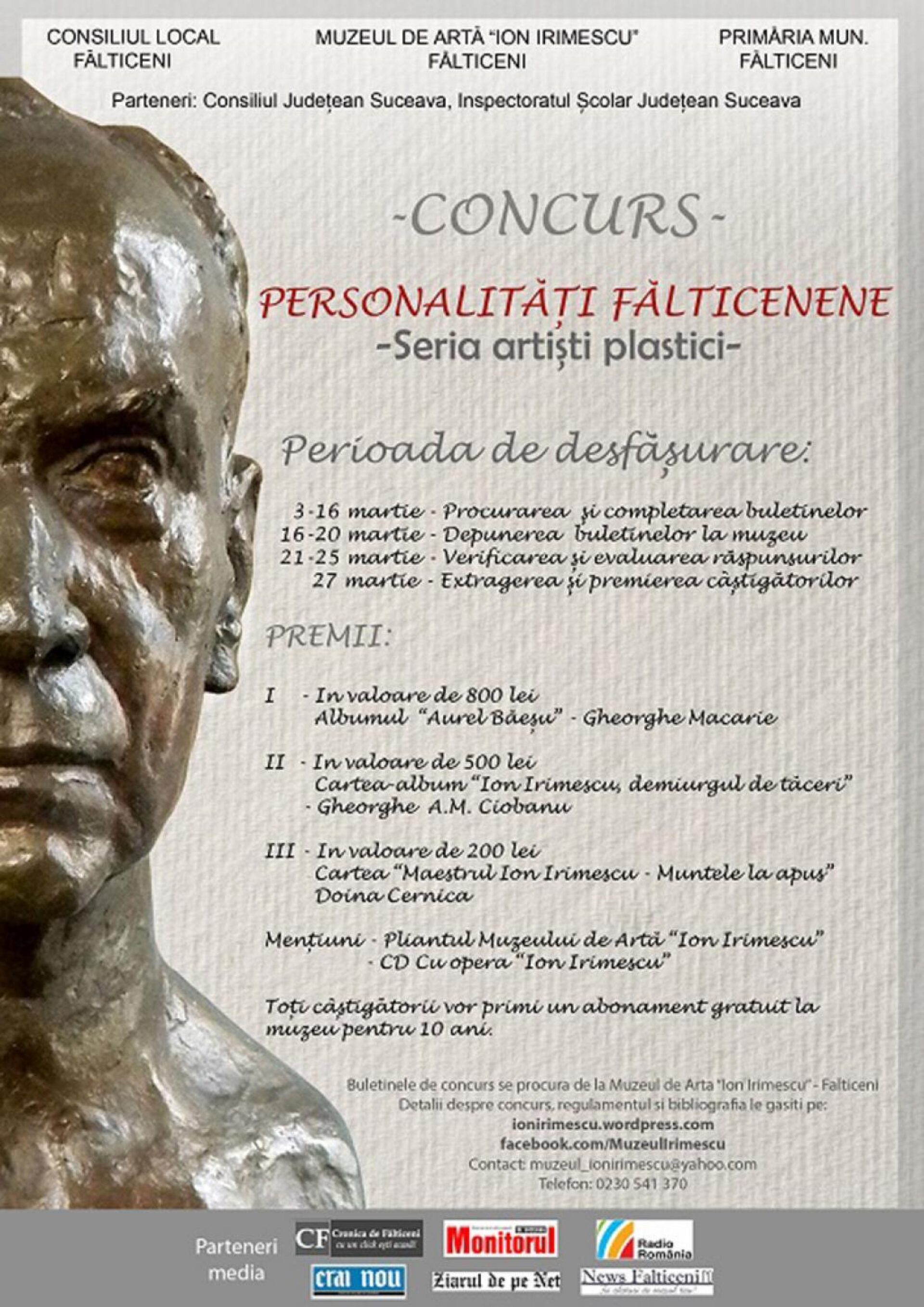 Primăria municipiului Fălticeni, Consiliul Local al municipiului Fălticeni, Muzeul de Artă „Ion Irimescu”, alături de Consiliul Județean Suceava și Inspectoratul Școlar Județean Suceava organizează concursul „Personalități fălticenene” (seria artiști plastici) destinat elevilor de gimnaziu și de liceu.