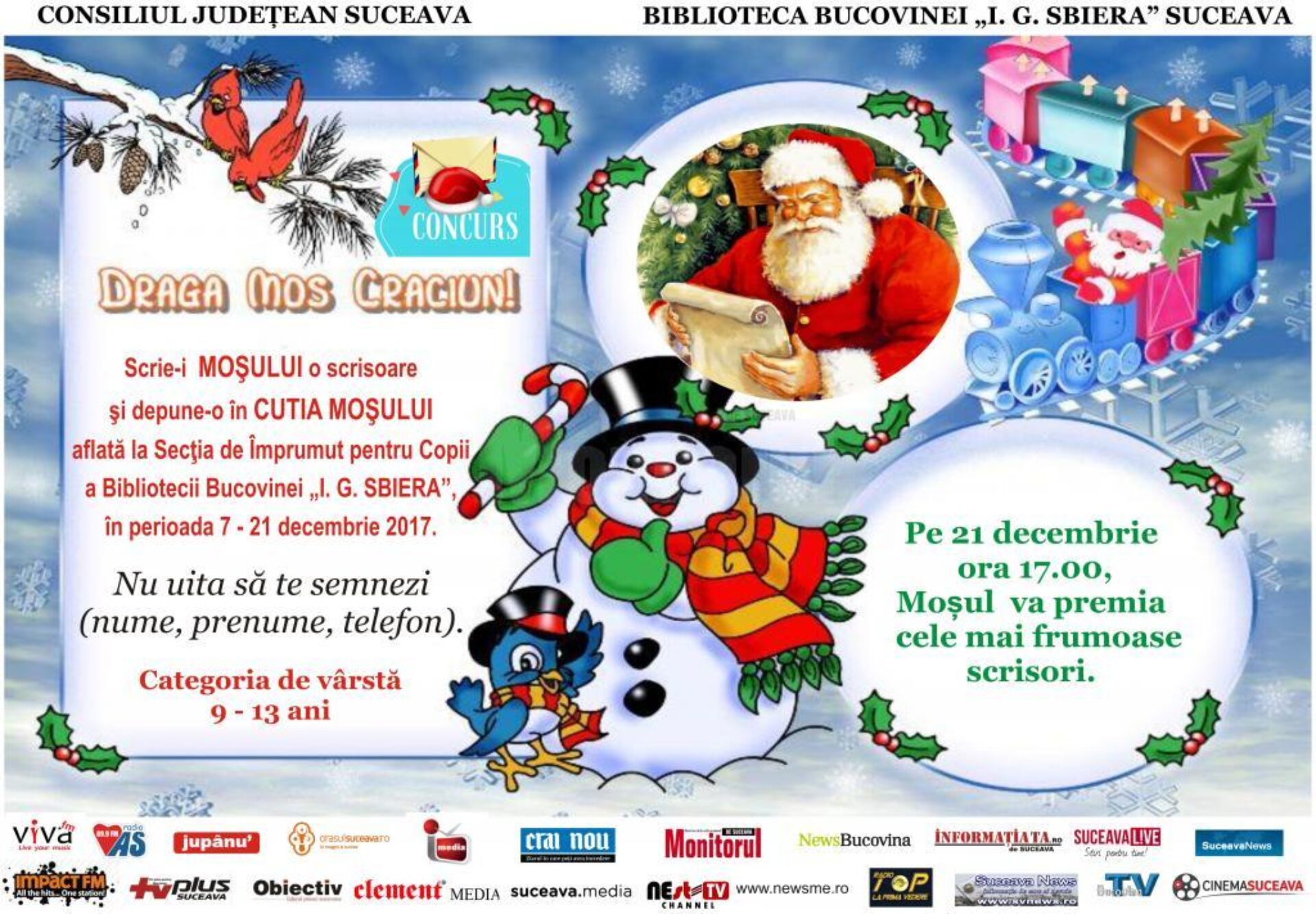 Biblioteca Bucovinei organizează concursul „Scrisoare către Moș Crăciun”în care vor fi premiate cele mai creative, originale și frumoase scrisori primite în perioada 7 – 21 decembrie 2017 de la copiii cu vârste cuprinse între 9-13 ani.Scrisorile pot fi depuse în CUTIA MOȘULUI aflată la Secția de Împrumut pentru Copii a bibliotecii sucevene.