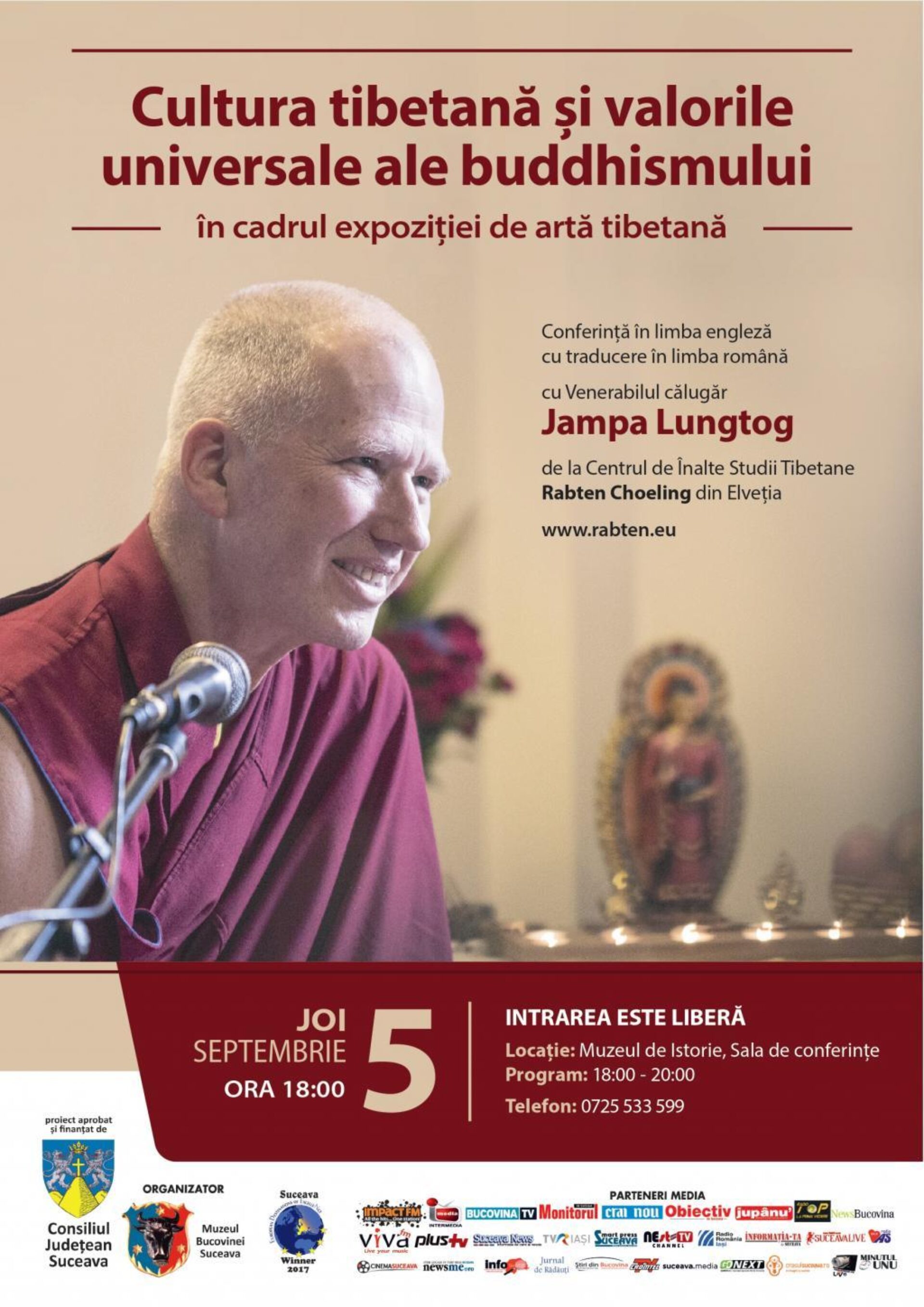 La Muzeul de Istoriedin Suceava va avea loc joi, 5 septembrie, de la ora 18, conferința publică cu tematica „Cultura tibetană și valorile universale ale buddhismului”, susținută pentru prima dată la Suceava de călugărul buddhist Jampa Lungtok, de la Centrul de Înalte Studii Tibetane Rabten Choeling din Elveția.