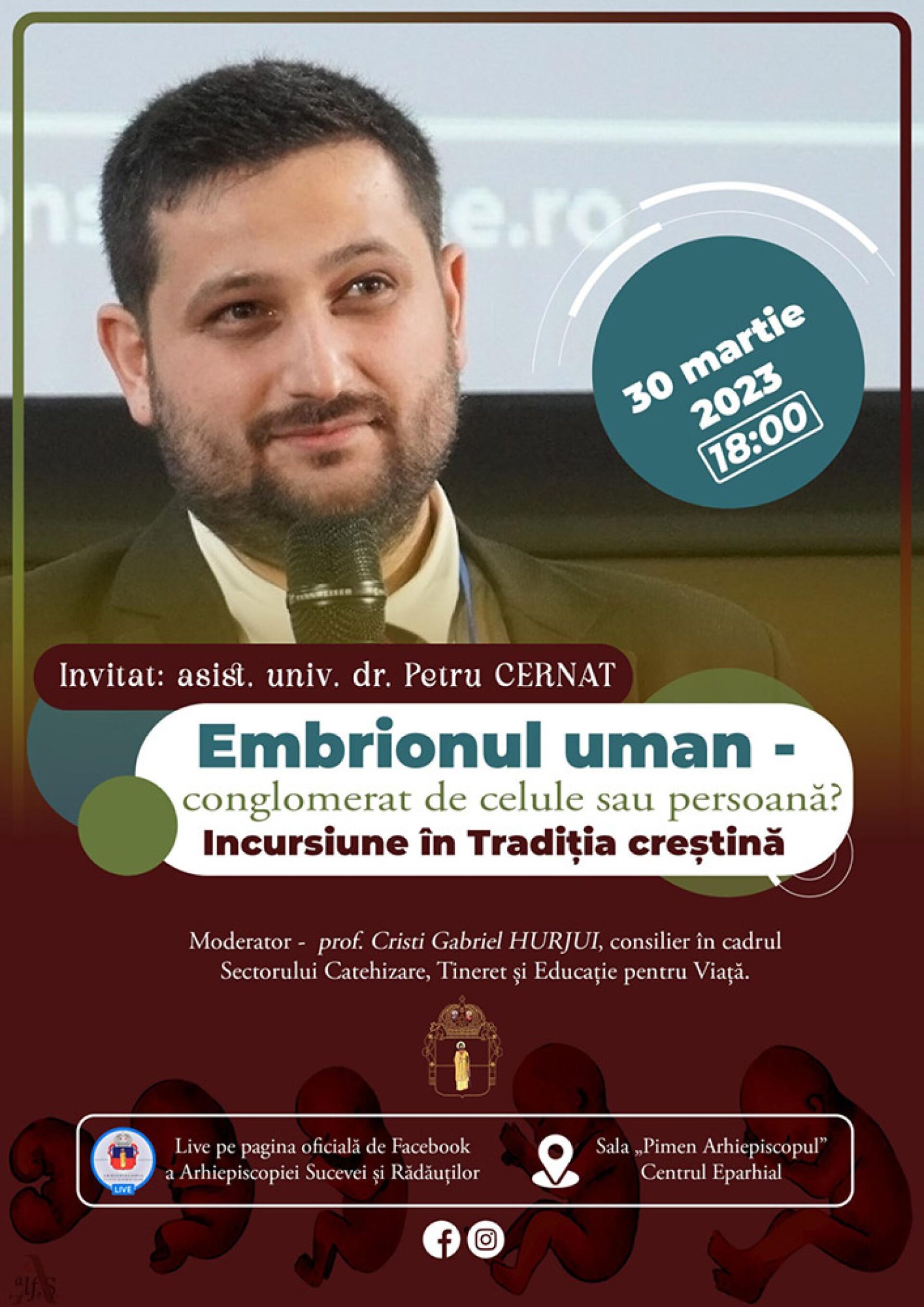 Arhiepiscopia Sucevei și Rădăuților organizează joi, 30 martie, de la ora 18:00, conferința „Embrionul uman – conglomerat de celule sau persoană? Incursiune în Tradiția creștină”, susținută de Petru Cernat, asistent universitar al Facultății de Teologie Ortodoxă „Dumitru Stăniloae” din Iași, Catedra de Teologie Morală. Conferința se va desfășura în Sala „Pimen Arhiepiscopul” – Centrul Eparhial Suceava – și se înscrie în seria de activități specifice lunii pentru viață, luna martie.