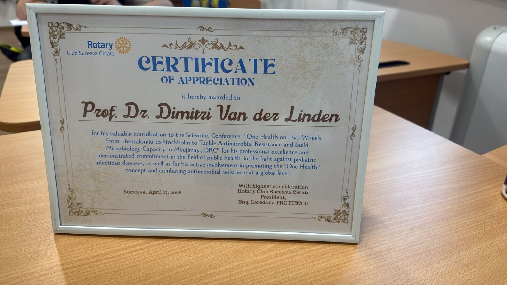 În semn de prețuire, Rotary Club Suceava Cetate, prin președinta Loredana Proțiencu, i-a conferit profesorului Van der Linden un „Certificat de apreciere” pentru „excelența profesională și angajamentul demonstrat în domeniul bolilor infecțioase pediatrice, precum și pentru implicarea activă în promovarea conceptului One Health la nivel global”.