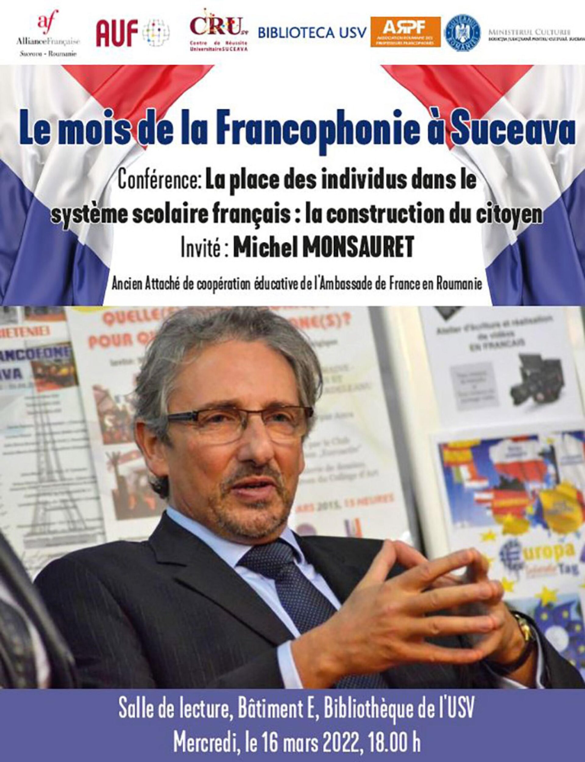 Seria activităților derulate de Alianța Franceză în cadrul Lunii Francofoniei la Suceava continuă cu conferința „La place des individus dans le système scolaire français: la construction du citoyen / Locul individului în sistemul școlar francez: construcția cetățeanului”, care va avea loc miercuri, 16 martie 2022, la ora 18.00, în Sala de lectură a Bibliotecii Universității „Ștefan cel Mare” din municipiul Suceava, corp E.