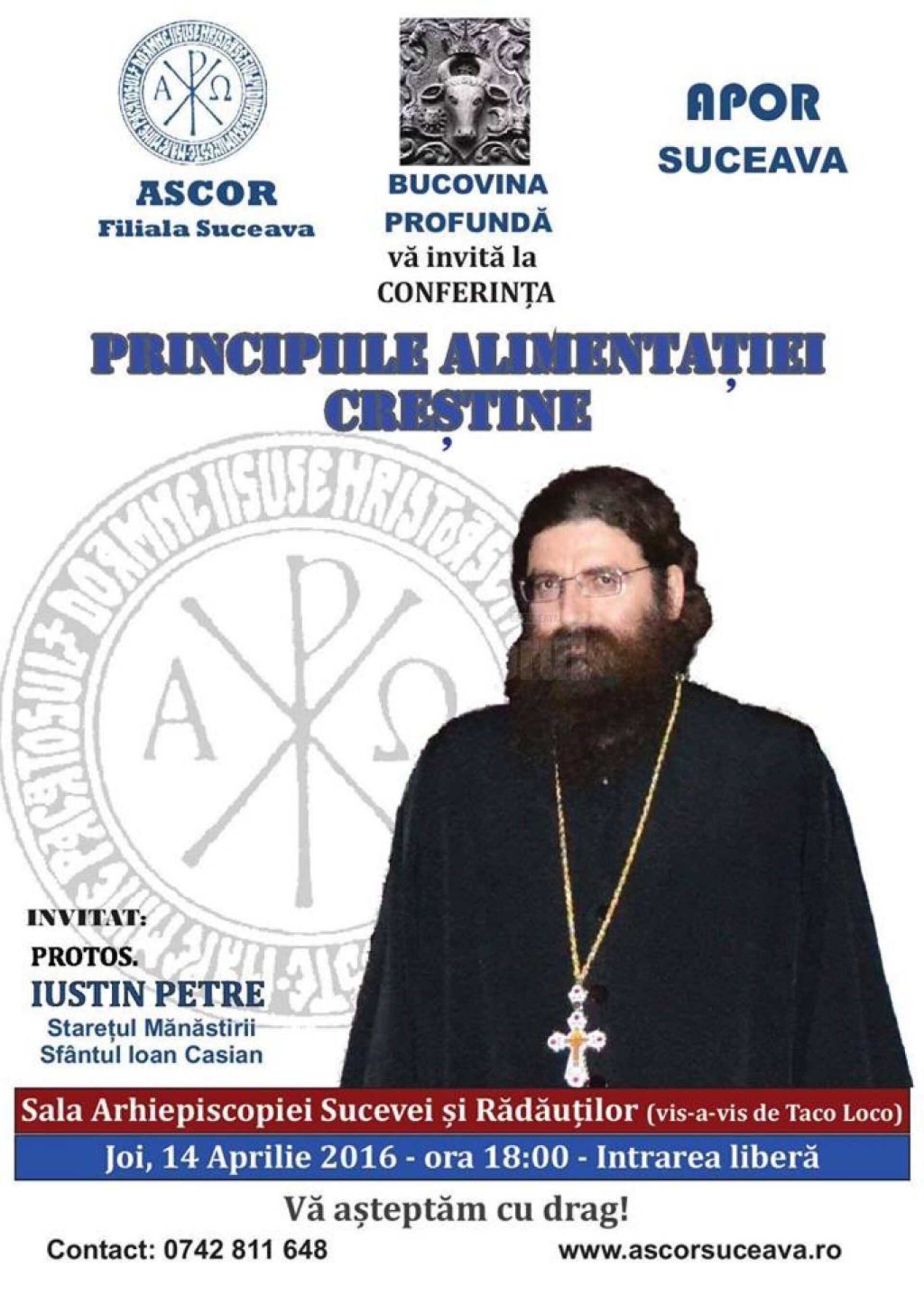 ASCOR – Filiala Suceava, Bucovina Profundă și APOR Suceava organizează joi, 14 aprilie a.c., începând cu ora 18.00, în Sala Arhiepiscopiei Sucevei și Rădăuților din municipiul Suceava, conferința cu tema „Principiile alimentației creștine”.