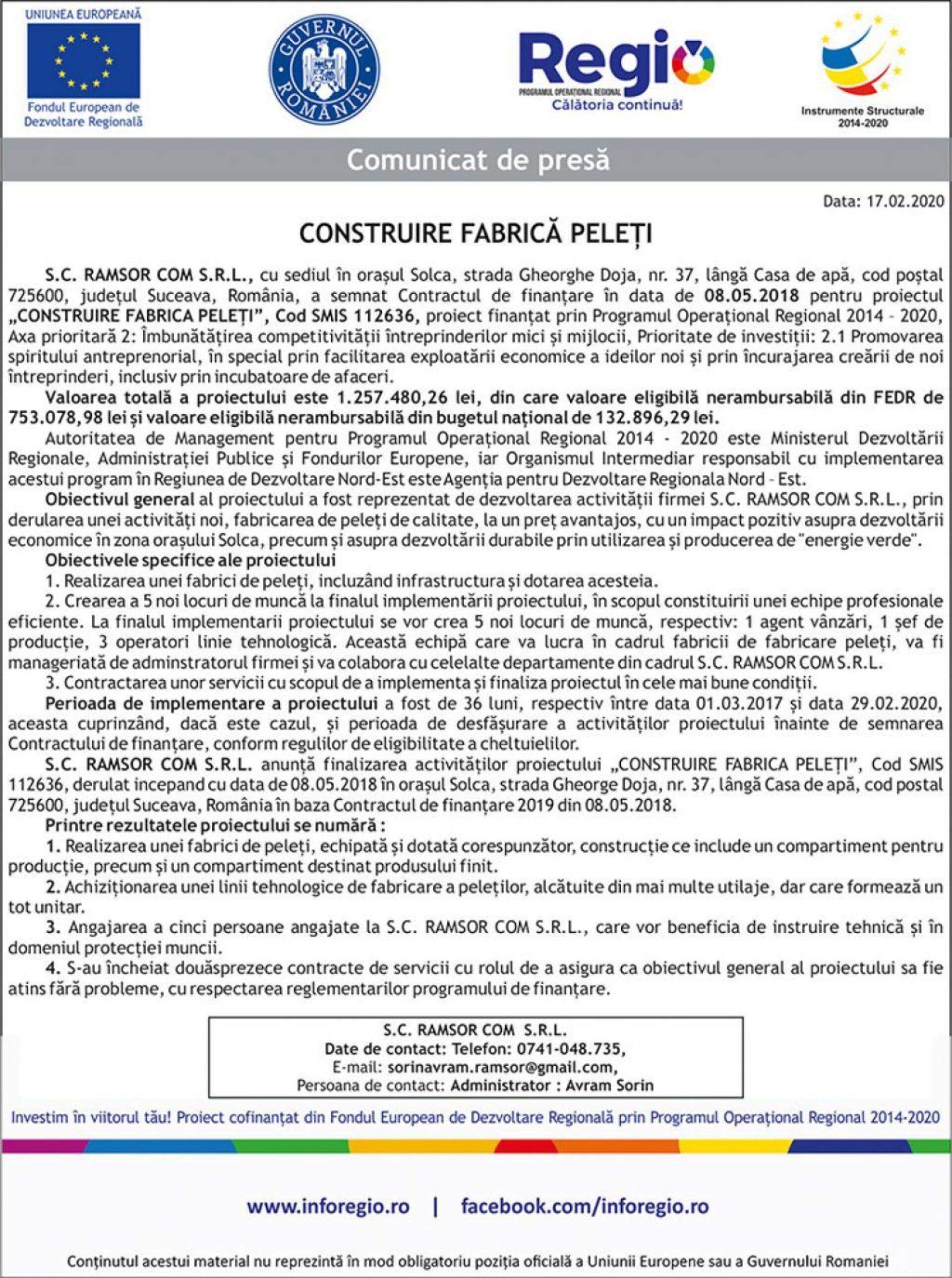 S.C. RAMSOR COM S.R.L., cu sediul în orașul Solca, strada Gheorghe Doja, nr. 37, lângă Casa de apă, cod poștal 725600, județul Suceava, România,a semnat Contractul de finanțare în data de 08.05.2018 pentru proiectul „CONSTRUIRE FABRICA PELEȚI”, Cod SMIS 112636,proiect finanțat prin Programul Operațional Regional 2014 – 2020, Axa prioritară 2: Îmbunătățirea competitivității întreprinderilor mici și mijlocii, Prioritate de investiții: 2.1 Promovarea spiritului antreprenorial, în special prin facilitarea exploatării economice a ideilor noi și prin încurajarea creării de noi întreprinderi, inclusiv prin incubatoare de afaceri.