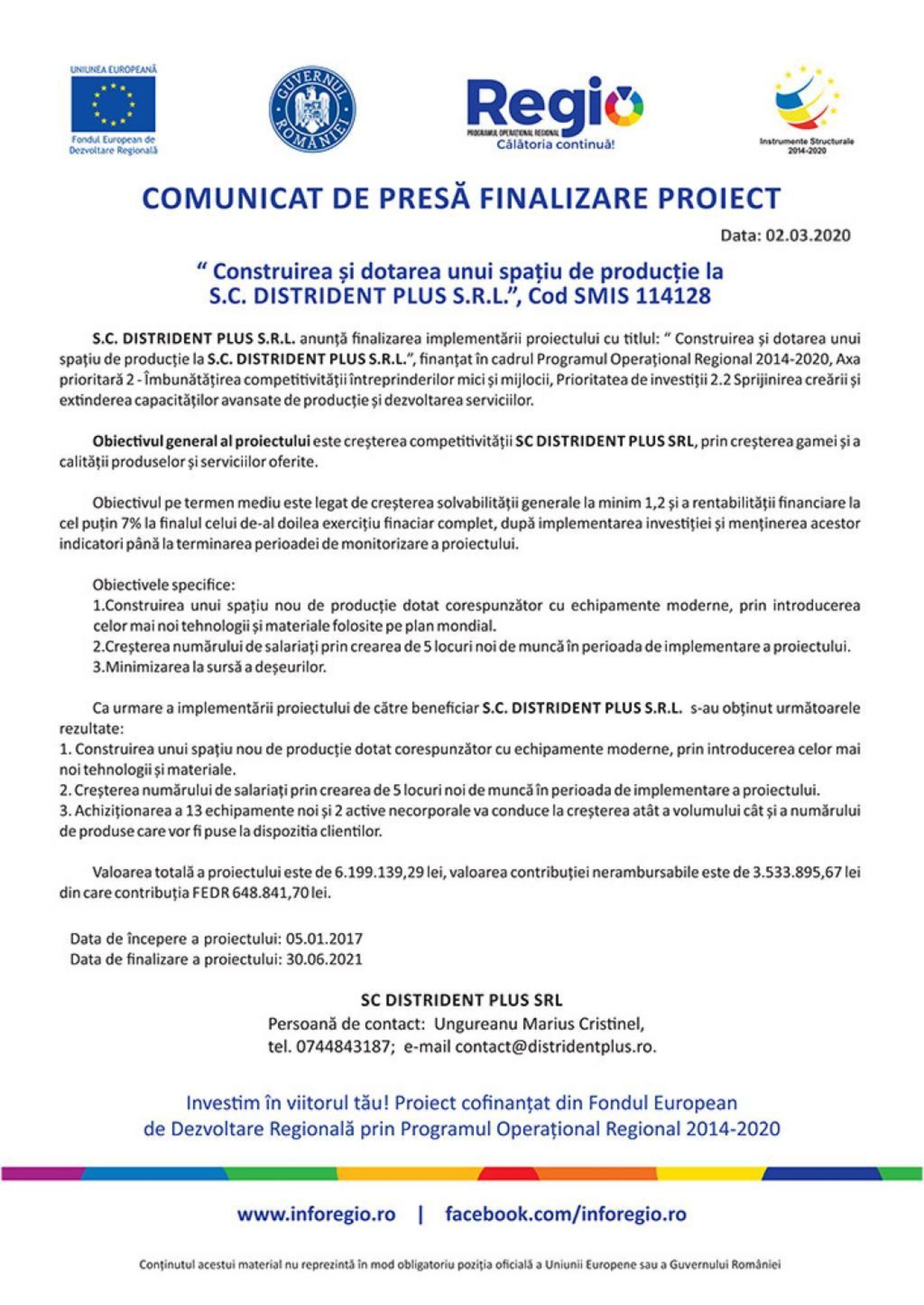 S.C. DISTRIDENT PLUS S.R.L. anunță finalizarea implementării proiectului cu titlul: „Construirea și dotarea unui spațiu de producție la S.C. DISTRIDENT PLUS S.R.L.”, finanțat în cadrul Programul Operațional Regional 2014-2020, Axa prioritară 2 – Îmbunătățirea competitivității întreprinderilor mici și mijlocii, Prioritatea de investiții 2.2 Sprijinirea creării și extinderea capacităților avansate de producție și dezvoltarea serviciilor.