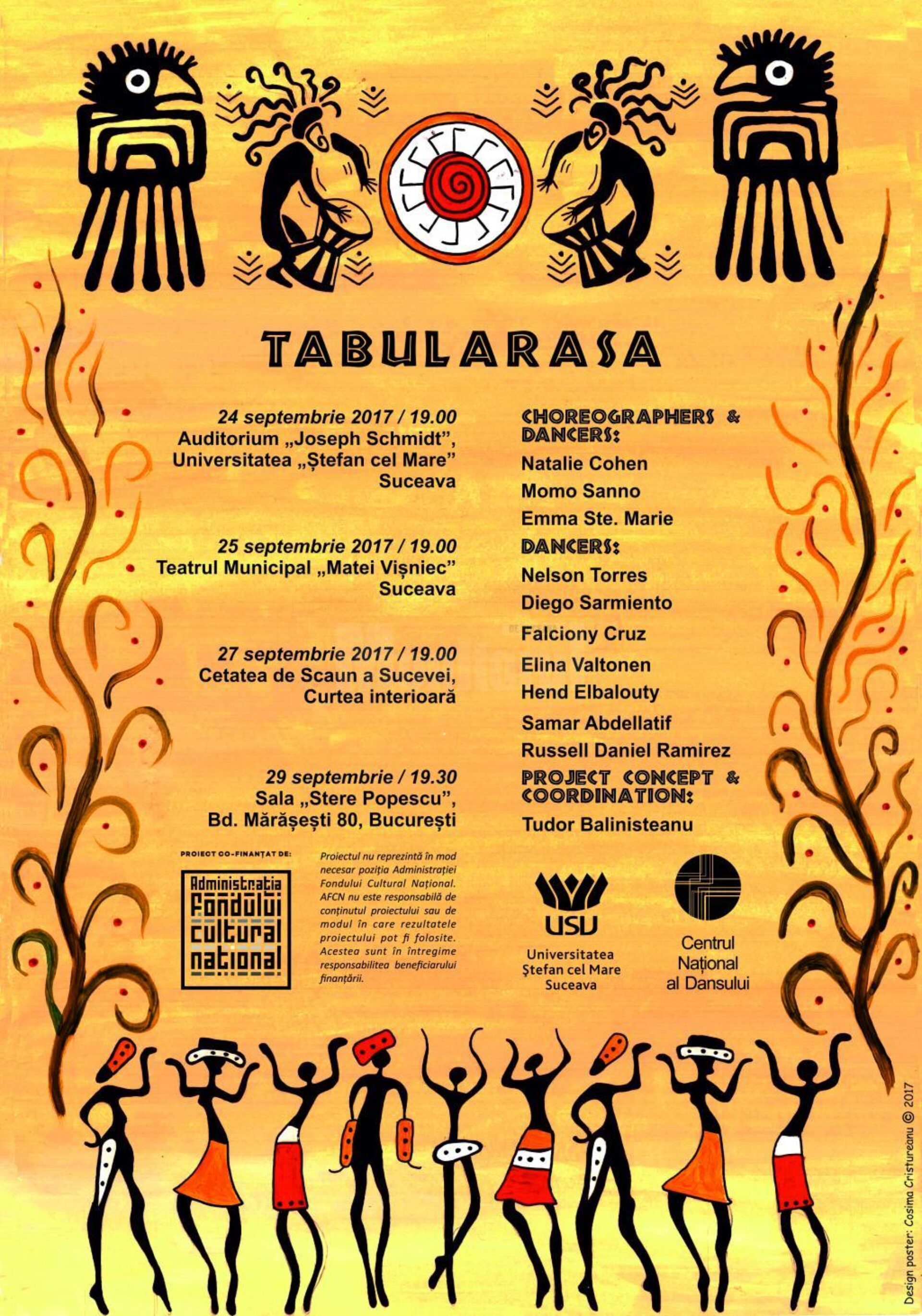 Echipa proiectului „Coregrafii sociale” prezintă spectacolul de dans contemporan „Tabularasa”. Evenimentul propus publicului sucevean evidențiază rolul dansului în vindecarea traumelor personale și sociale, incluzând elemente africane și sudamericane, în interpretarea a 10 dansatori din Columbia, România, Egipt, Finlanda, SUA și Canada.