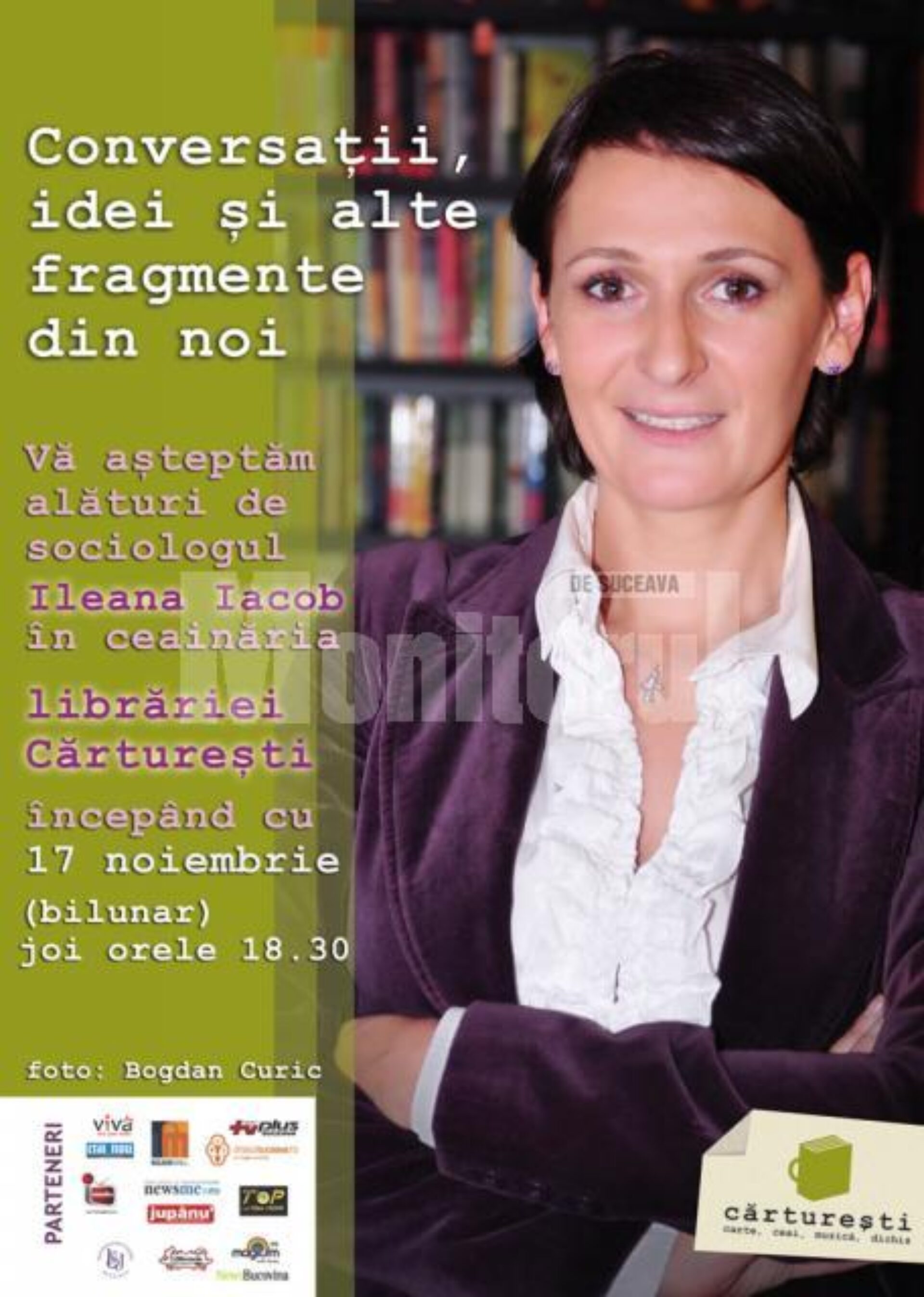 La ceainăria Librăriei Cărturești, din incinta Iulius Mall Suceava, va avea loc mâine, la ora 18:30, o nouă întâlnire cu sociologul Ileana Iacob.