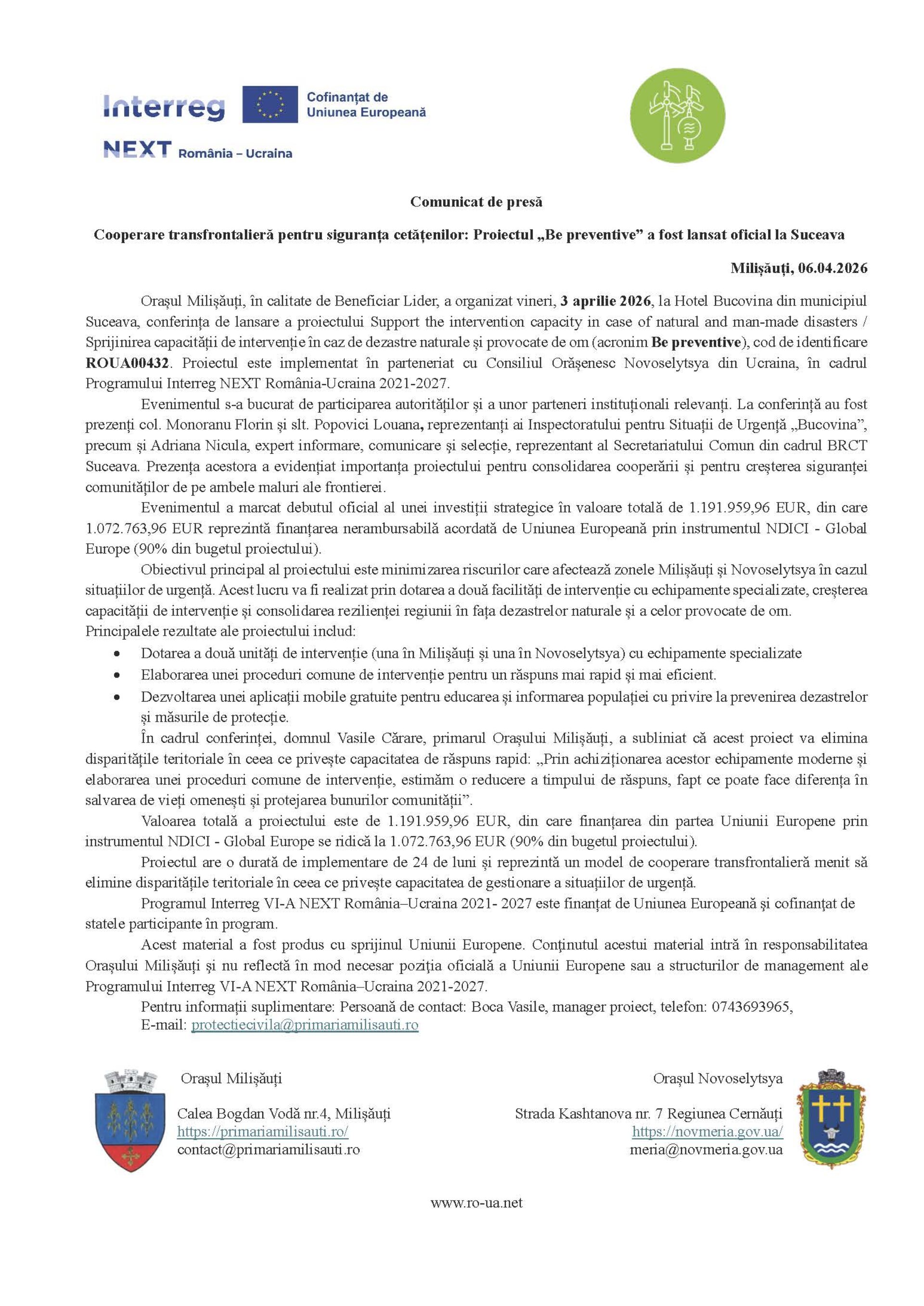 Orașul Milișăuți, în calitate de Beneficiar Lider, a organizat vineri, 3 aprilie 2026, la Hotel Bucovina din municipiul Suceava, conferința de lansare a proiectului Support the intervention capacity in case of natural and man-made disasters / Sprijinirea capacității de intervenție în caz de dezastre naturale și provocate de om (acronim Be preventive), cod de identificare ROUA00432. Proiectul este implementat în parteneriat cu Consiliul Orășenesc Novoselytsya din Ucraina, în cadrul Programului Interreg NEXT România-Ucraina 2021-2027.