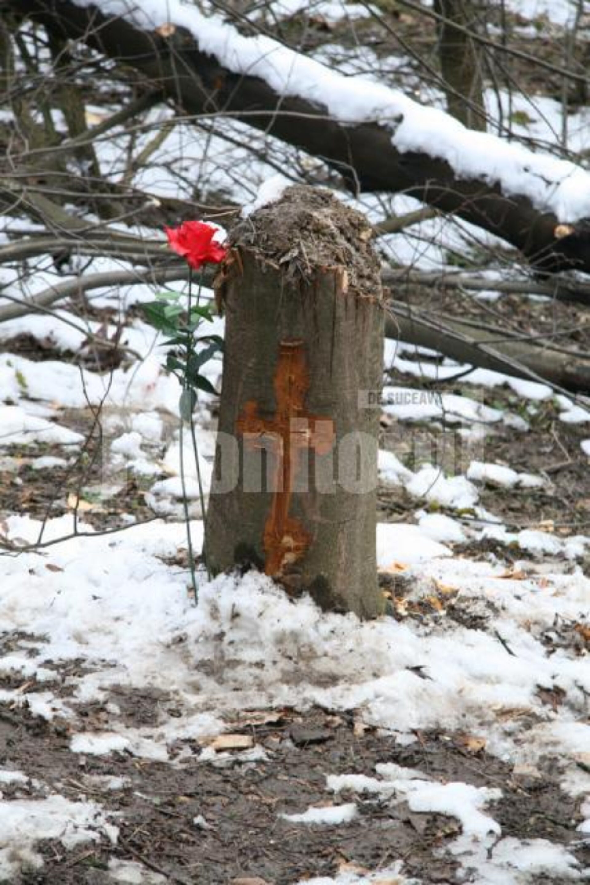 Pe trunchi, cineva a sculptat o cruce și a pus doi trandafiri artificiali, unul alb și unul roșu.