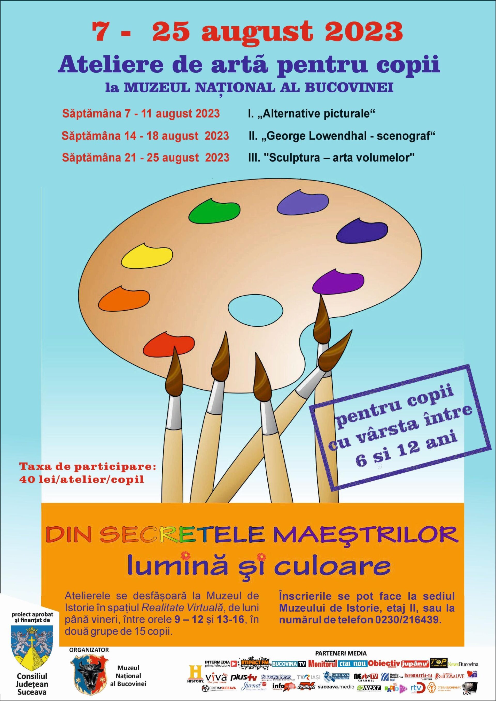 Muzeul Național al Bucovinei organizează și în acest an Atelierele de artă pentru copii „Din secretele maeștrilor – lumină și culoare”, care se vor desfășura, în perioada 7-25 august 2023, la sediul Muzeului de Istorie.