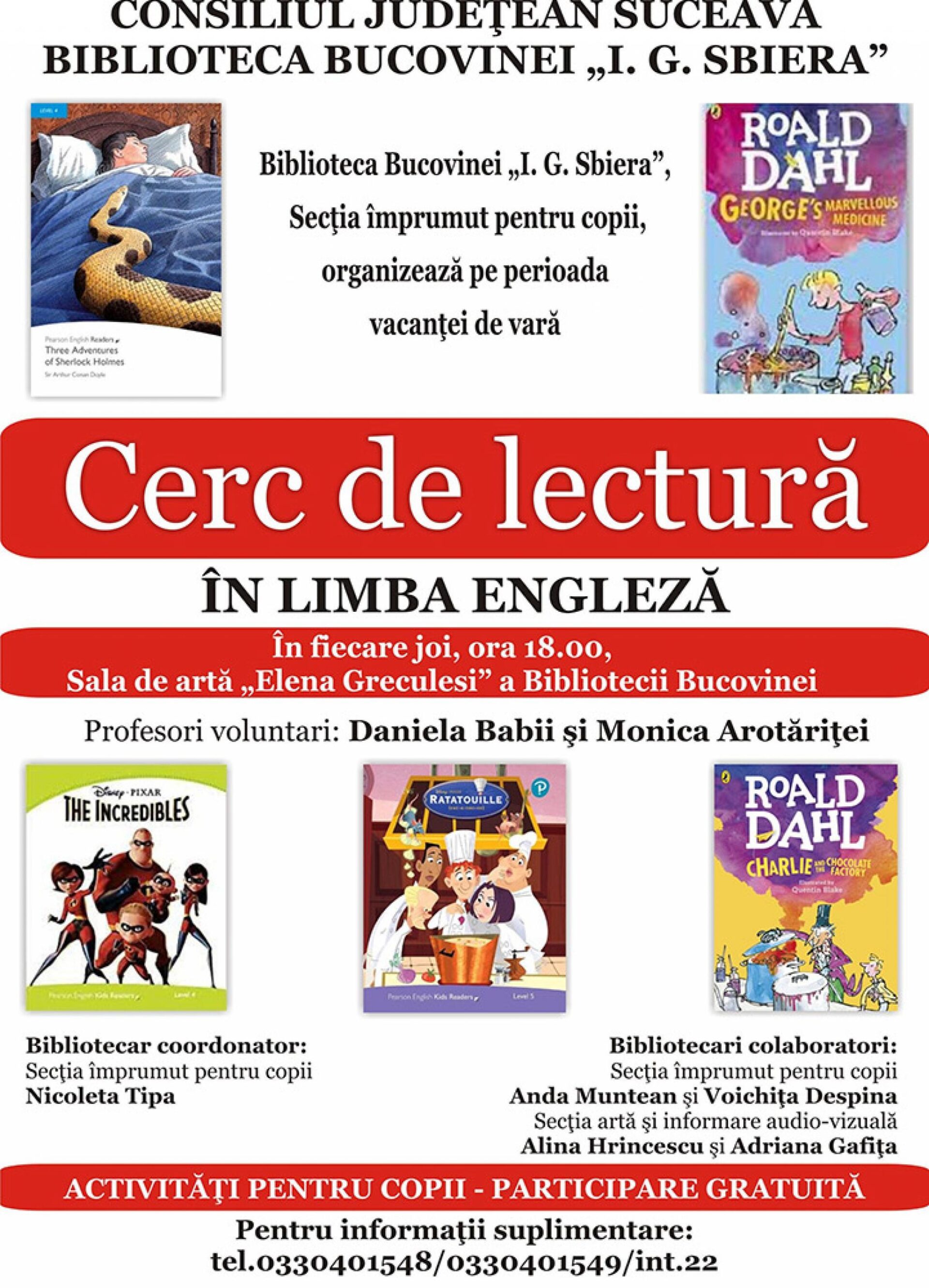 Biblioteca Bucovinei „I. G. Sbiera”, Secția împrumut pentru copii, organizează un cerc de lectură în limba engleză, dedicat micilor cititori. Activitățile se vor desfășura în fiecare joi, cu începere de la ora 18.00, în Sala de artă „Elena Greculesi” a bibliotecii, situată la etajul I al corpului A. După cum a comunicat managerul Bibliotecii Bucovinei, Gabriel Cărăbuș, lectura unor cărți cu text simplificat, pe diferite grade de dificultate, ascultarea CD-urilor atașate cărților și traducerea lor, vizionarea DVD-urilor cu filme realizate după cărțile citite, cu ajutorul celor două profesoare voluntare, Daniela Babii (de la Școala Gimnazială Nr. 10) și Monica Arotăriței (de la Colegiul de Artă „Ciprian Porumbescu”), vor ajuta copiii înscriși în acest proiect să-și aprofundeze cunoștințele de limbă engleză. Aceștia vor avea posibilitatea să-și îmbunătățească pronunția și să-și îmbogățească vocabularul prin conversație, joc și revizuirea regulilor gramaticale, toate aceste activități desfășurându-se într-o atmosferă relaxată, de vacanță, în ambientul plăcut al sălilor Bibliotecii Bucovinei.
