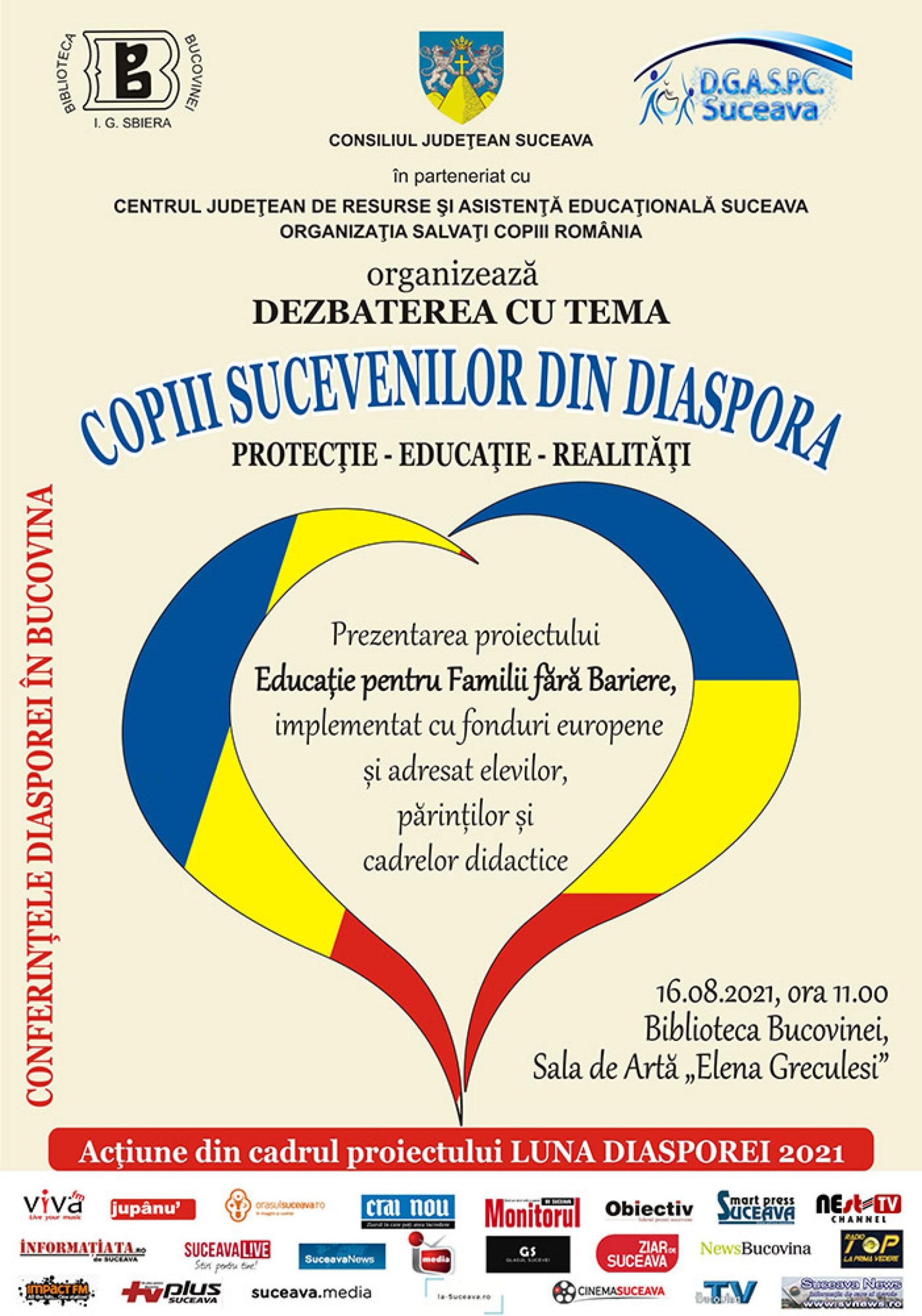 Luni, 16 august, începând cu ora 11.00, în Sala de Artă „Elena Greculesi” a Bibliotecii Bucovinei se vor desfășura „Conferințele diasporei în Bucovina”, o dezbaterea cu tema “Copiii sucevenilor din Diaspora – Protecție-Educație-Realități”. Activitatea este organizată în cadrul proiectului „Luna Diasporei” derulat de Consiliul Județean Suceava, organizatori fiind Biblioteca Bucovinei „I.G. Sbiera” și DGASPC Suceava, sub egida Consiliului Județean Suceava, în parteneriat cu Centrul Județean de Resurse și Asistență Educațională Suceava și Organizația Salvați Copiii România.