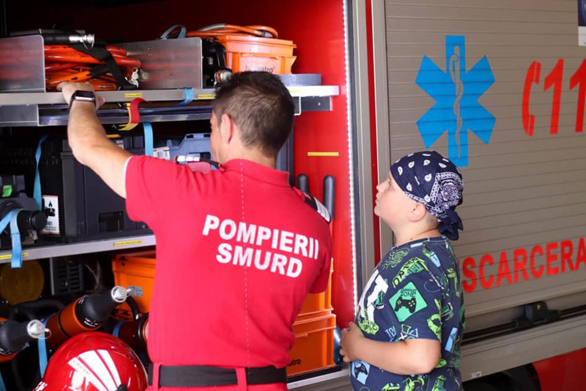 Mai mult, i-au făcut un tur de onoare printre autospecialele de intervenție și i-au povestit întâmplări din activitatea lor.