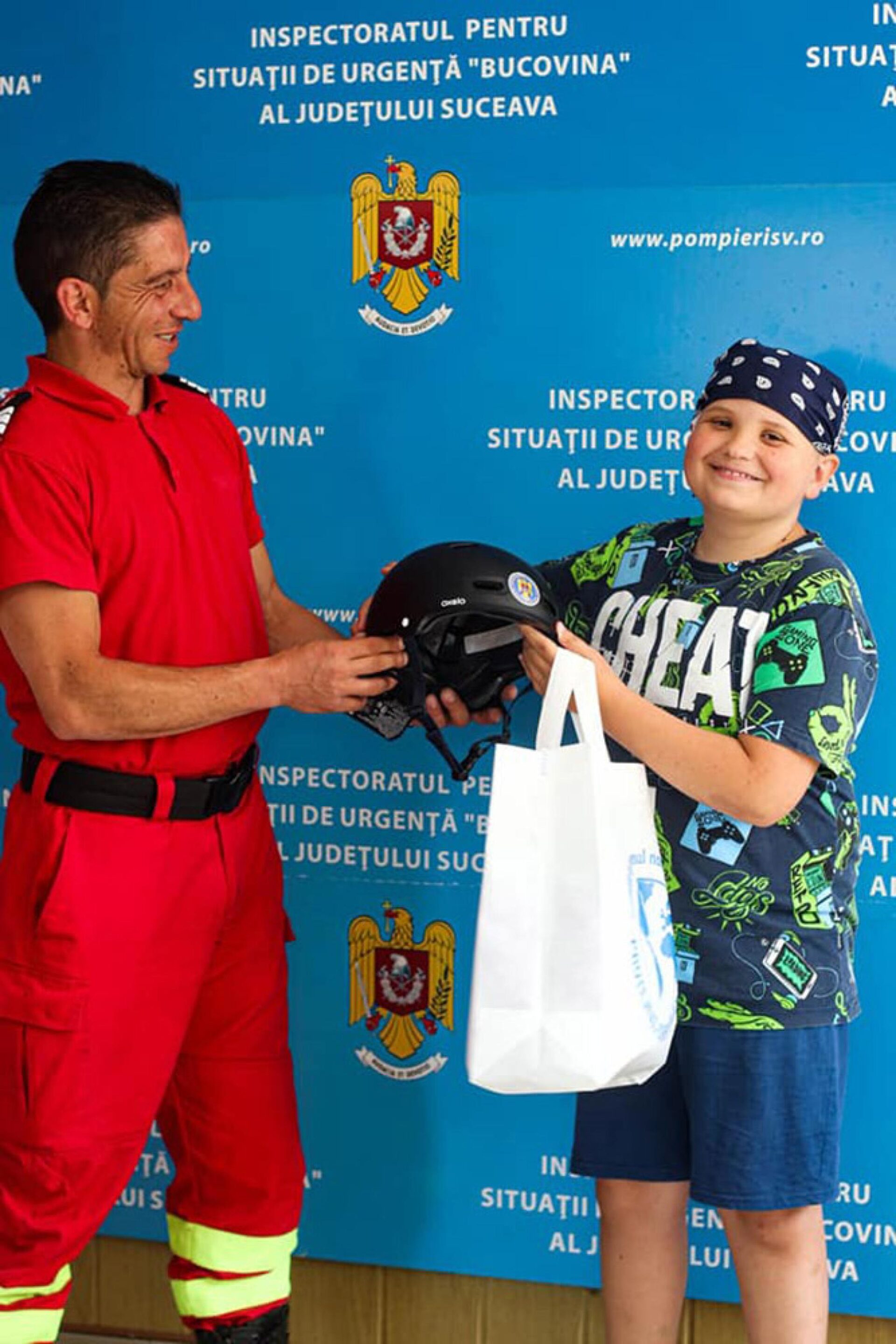 La revenirea la spital pentru control medical, Cristian și Andrei s-au întâlnit din nou. De data aceasta, la sediul Inspectoratului pentru Situații de Urgență Suceava, unde pompierii militari suceveni i-au făcut cadou un set complet de protecție, cu cască, genunchiere, cotiere etc, pentru atunci când se va urca din nou pe bicicletă.