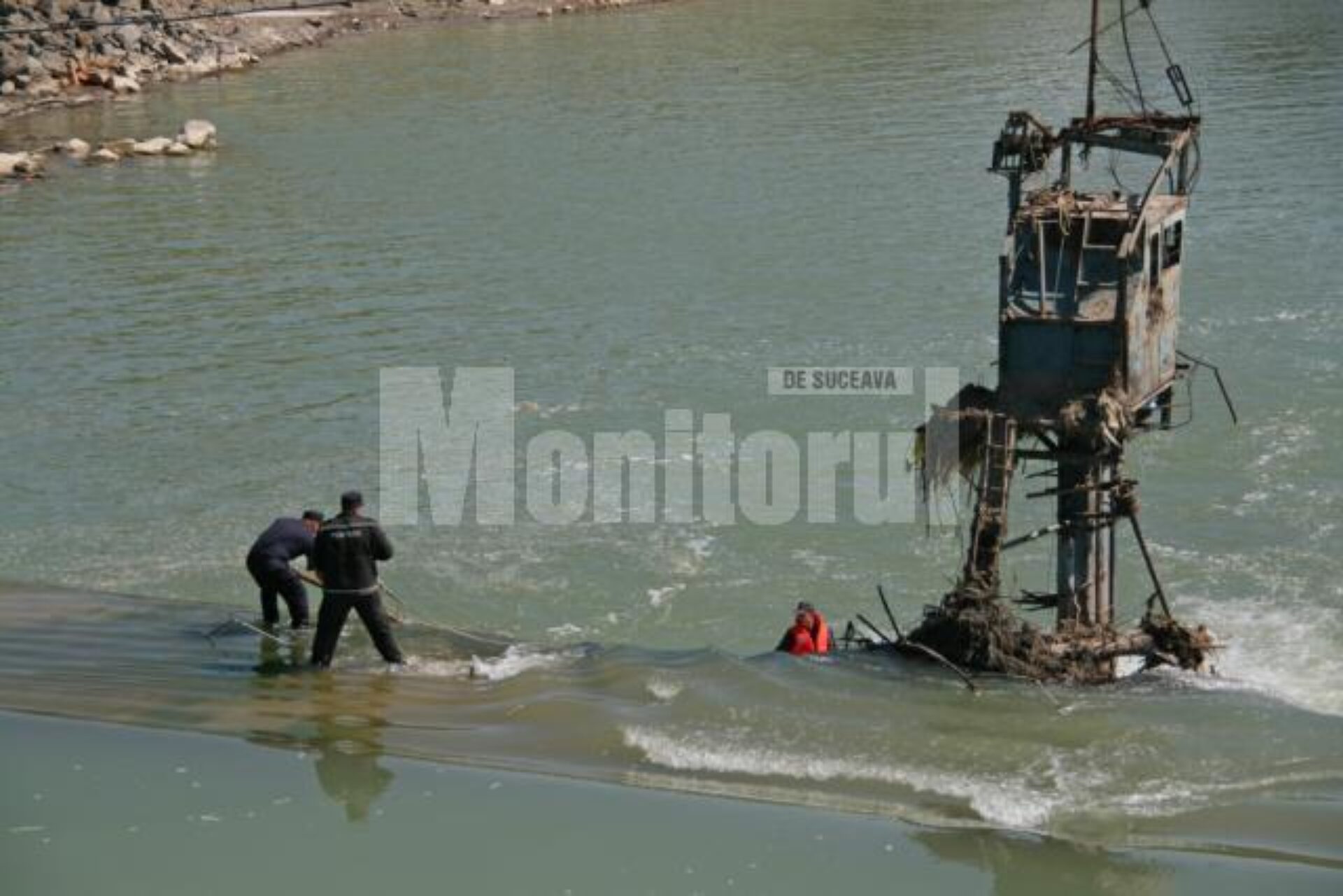 Tragedia s-a petrecut la câțiva metri în aval de pod, pe platforma pe care se află și un utilaj care acum nu mai este funcțional.