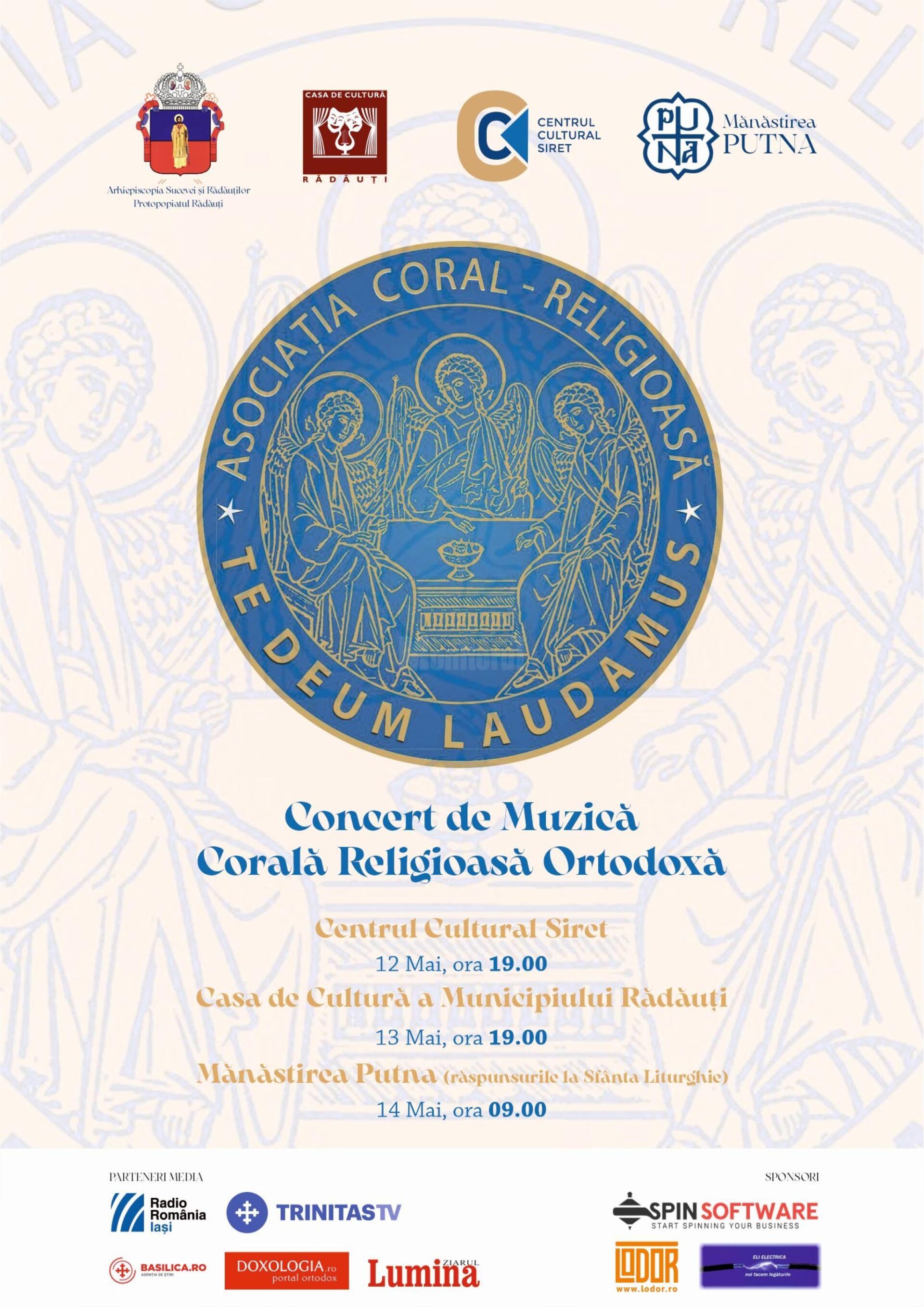 Corala Bărbătească „Te Deum Laudamus” din București va concerta, în perioada 12 – 14 mai 2023, la Siret, Rădăuți și Putna. Arhiepiscopia Sucevei și Rădăuților – Protopopiatul Rădăuți, Casa de Cultură a Municipiului Rădăuți, Centrul Cultural Siret și Mănăstirea Putna organizează, în perioada 12-14 mai 2023, un turneu de concerte de muzică corală religioasă ortodoxă susținut de Corala Bărbătească Te Deum Laudamus. Această activitate se desfășoară sub egida Anului comemorativ al imnografilor și cântăreților bisericești. Calendarul concertelor: 12 mai 2023, ora 19:00 – Casa de Cultură „Mihai Teliman” din Siret; 13 mai 2023, ora 19:00 – Casa de Cultură a Municipiului Rădăuți; 14 mai 2023, ora 9:00 – Mănăstirea Putna (răspunsurile la Sfânta Liturghie). Intrarea este liberă.