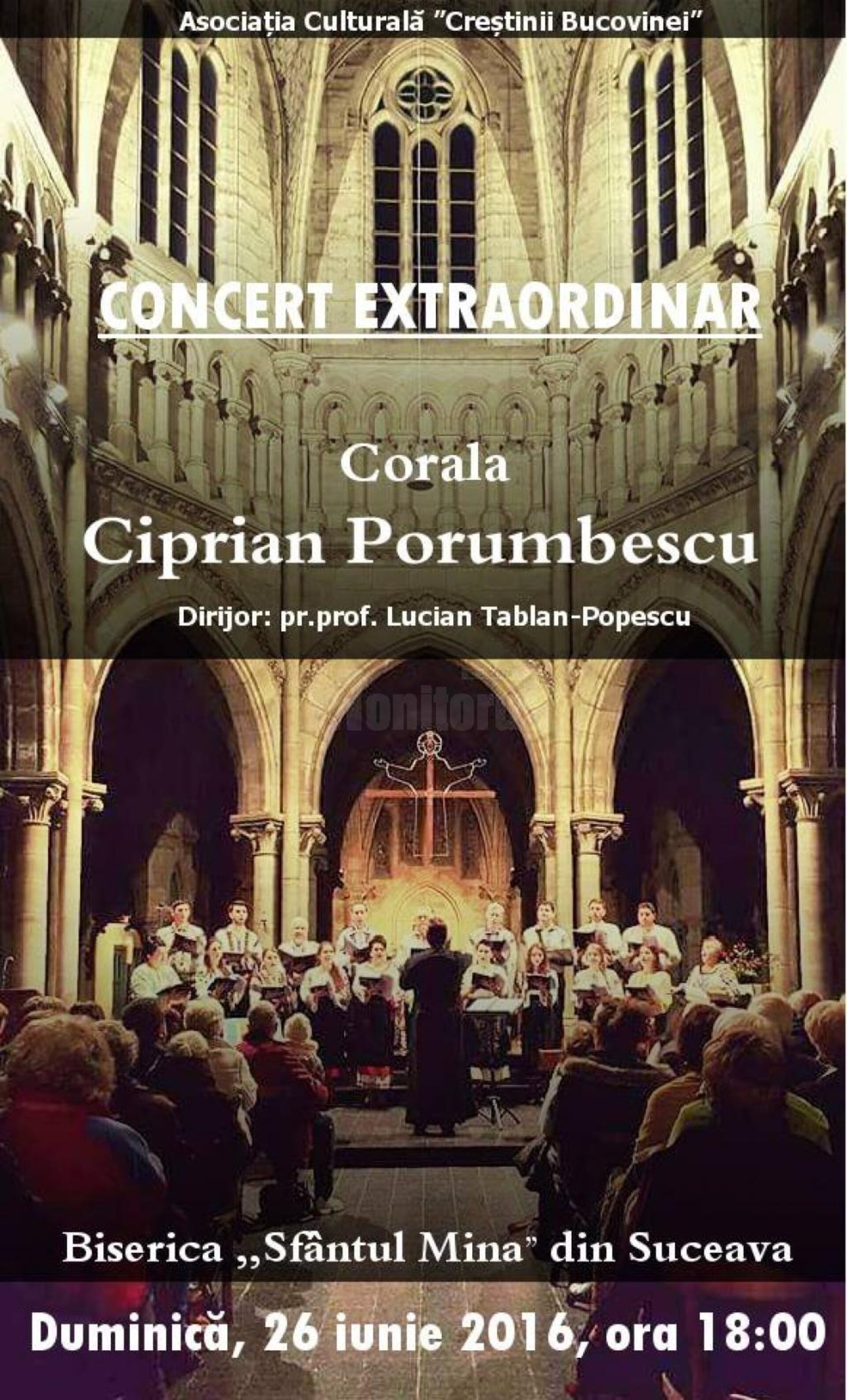 La Biserica“Sfântul Mina” din Suceava va avea loc duminică, 26 iunie, de la ora 18:00, un concert extraordinar susținut de Corala „Ciprian Porumbescu”, dirijor preot profesor Lucian Tablan-Popescu. Evenimentul este organizat de Asociația Culturală „Creștinii Bucovinei”. Intrarea este liberă.
