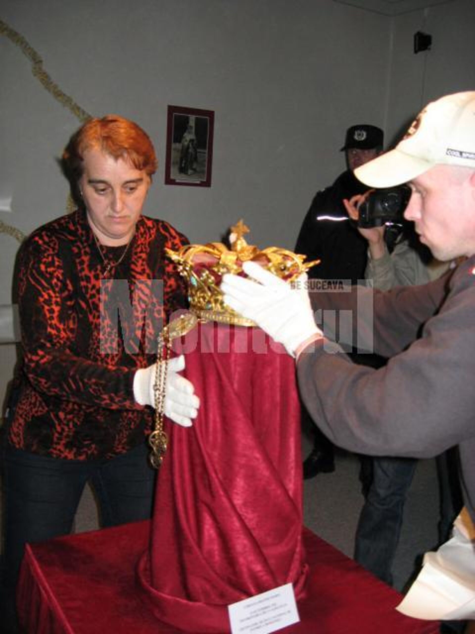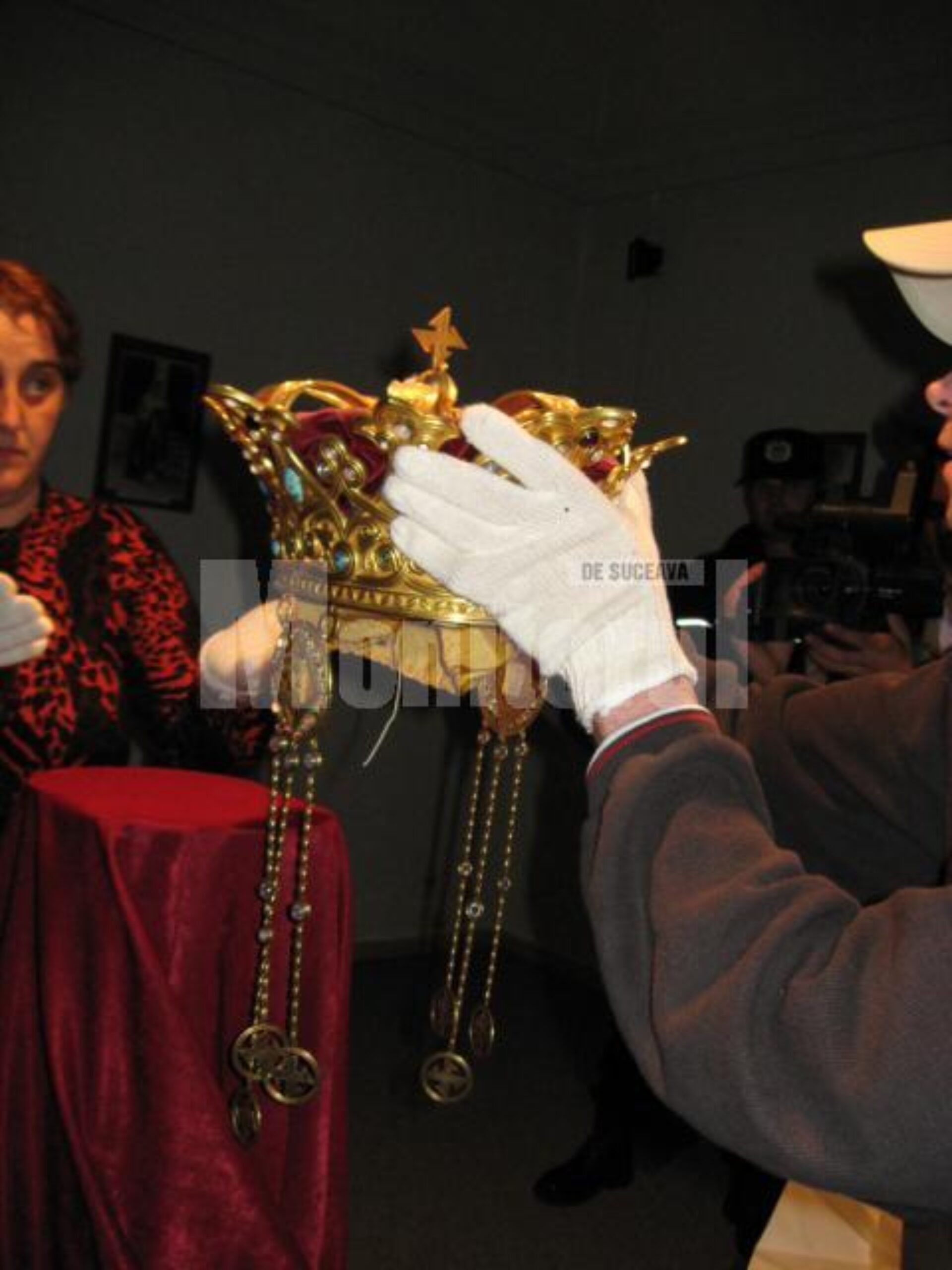 Ușor deformată (turtită) din pricina modului în care a fost depozitată, Coroana Reginei Maria, care a părăsit acum pentru prima dată după anul 1998 (când a fost dusă la festivitățile de la Alba Iulia organizate cu prilejul împlinirii a 90 de ani de la înfăptuirea României Mari) Tezaurul din cadrul Muzeului Național de Istorie a României, a devenit, pentru zece zile, cel mai valoros exponat din muzeul sucevean.