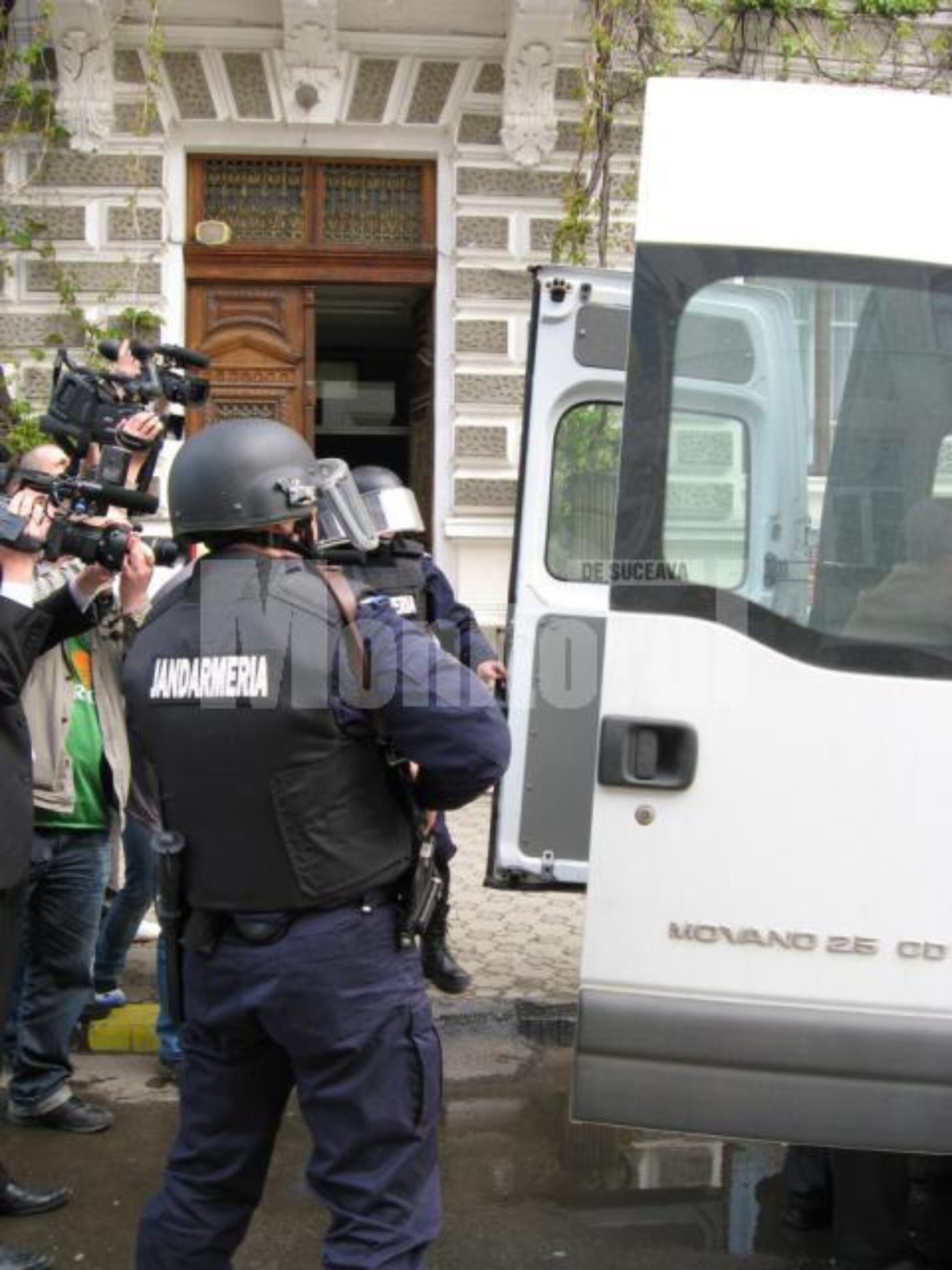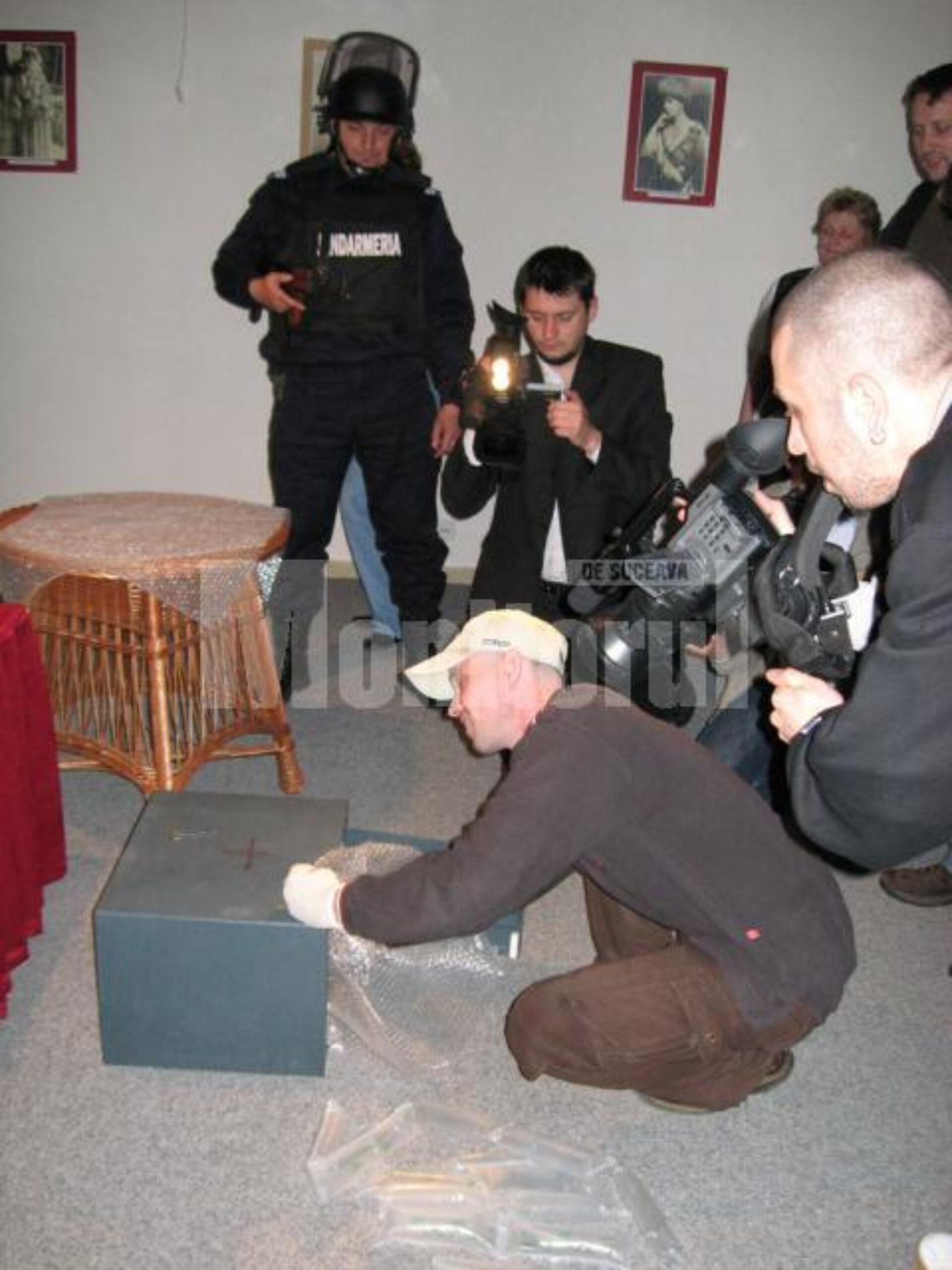 Doi jandarmi cu căști de protecție, veste anti-glonț și pistoalele automate s-au postat de o parte și de cealaltă a ușii din spatele microbuzului și, în prezența directorului CMB, Constantin-Emil Ursu, doi salariați din serviciul administrativ al muzeului sucevean au descărcat seiful și au intrat cu el în instituție.