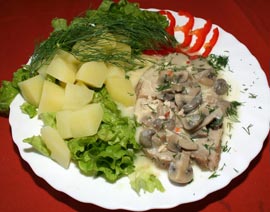 Cotletul re porc se frige într-o tigaie încinsă cu ulei de măsline (25 ml) până se rumenește și se condimentează cu sare și piper. Ciupercile se spală se taie sferturi și se călesc în ulei de măsline până capătă o culoare maronie după care se sting cu cinzano și zeamă de lămâie. Se condimentează după care se adaugă smântâna. Se lasă la fiert până se reduce sosul după care se adaugă verdeața.