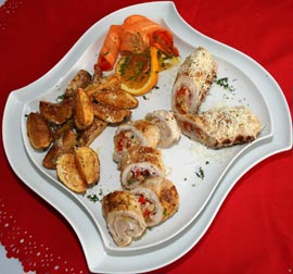 Cotletul se întinde pe planșetă, se condimentează, apoi se așează felii subțiri de șuncă presată și o compoziție mixtă formată din ciuperci, ceapă verde, ardei gras, toate acestea fiind trase la tigaie în puțin ulei de măsline. Acest rulou îl așezăm pe grătarul încins lăsându-l câte 5-6 minute pe fiecare parte.