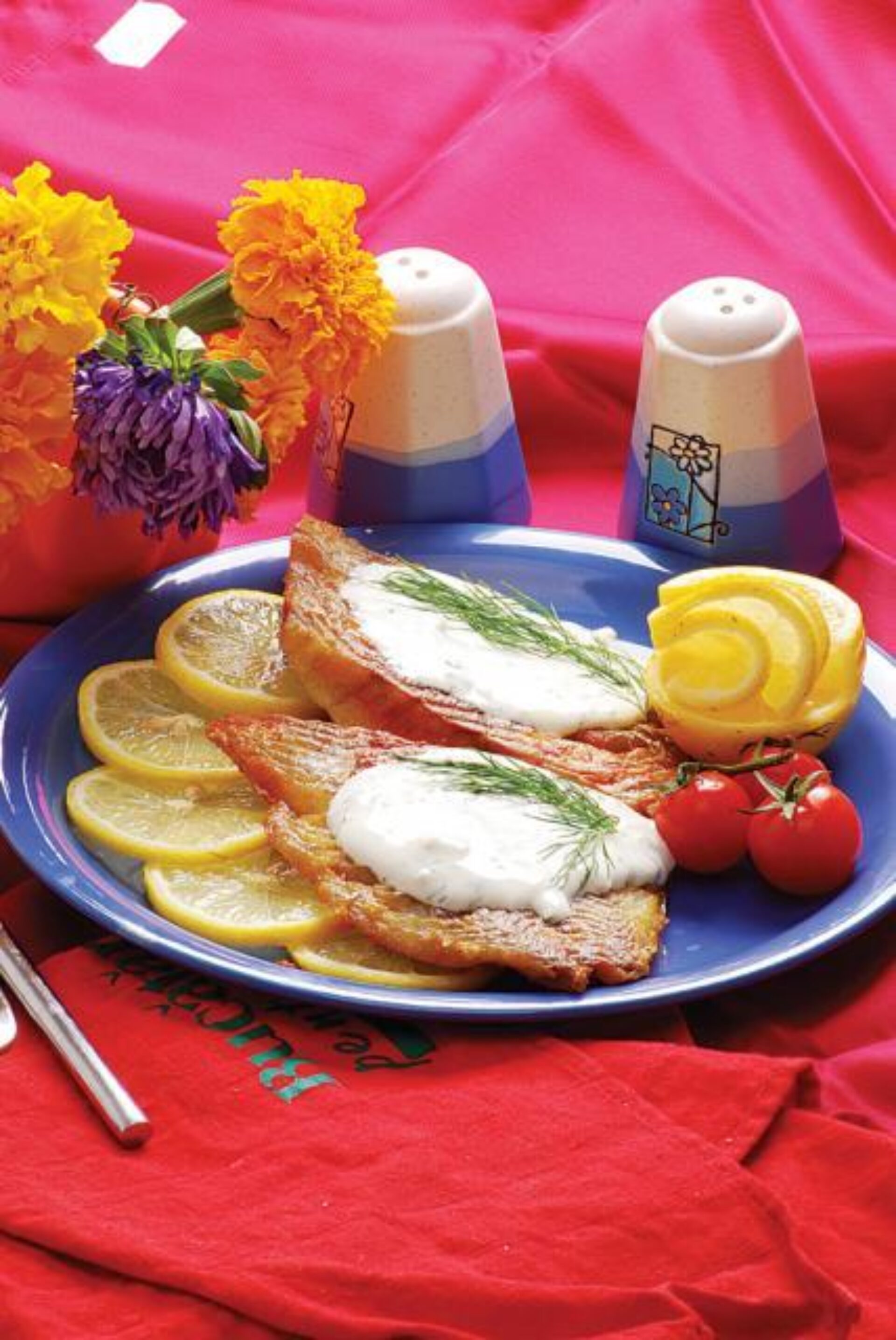 Se taie lămâile în felii, se pun pe farfurii, se pun fileurile deasupra și peste acestea se toarnă sosul de smântână și mărar. Se ornează cu mărar și feliuțe de lămâie.