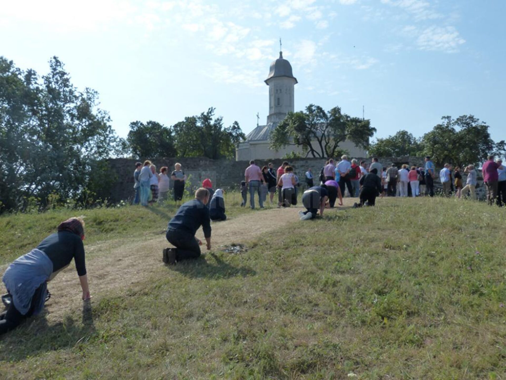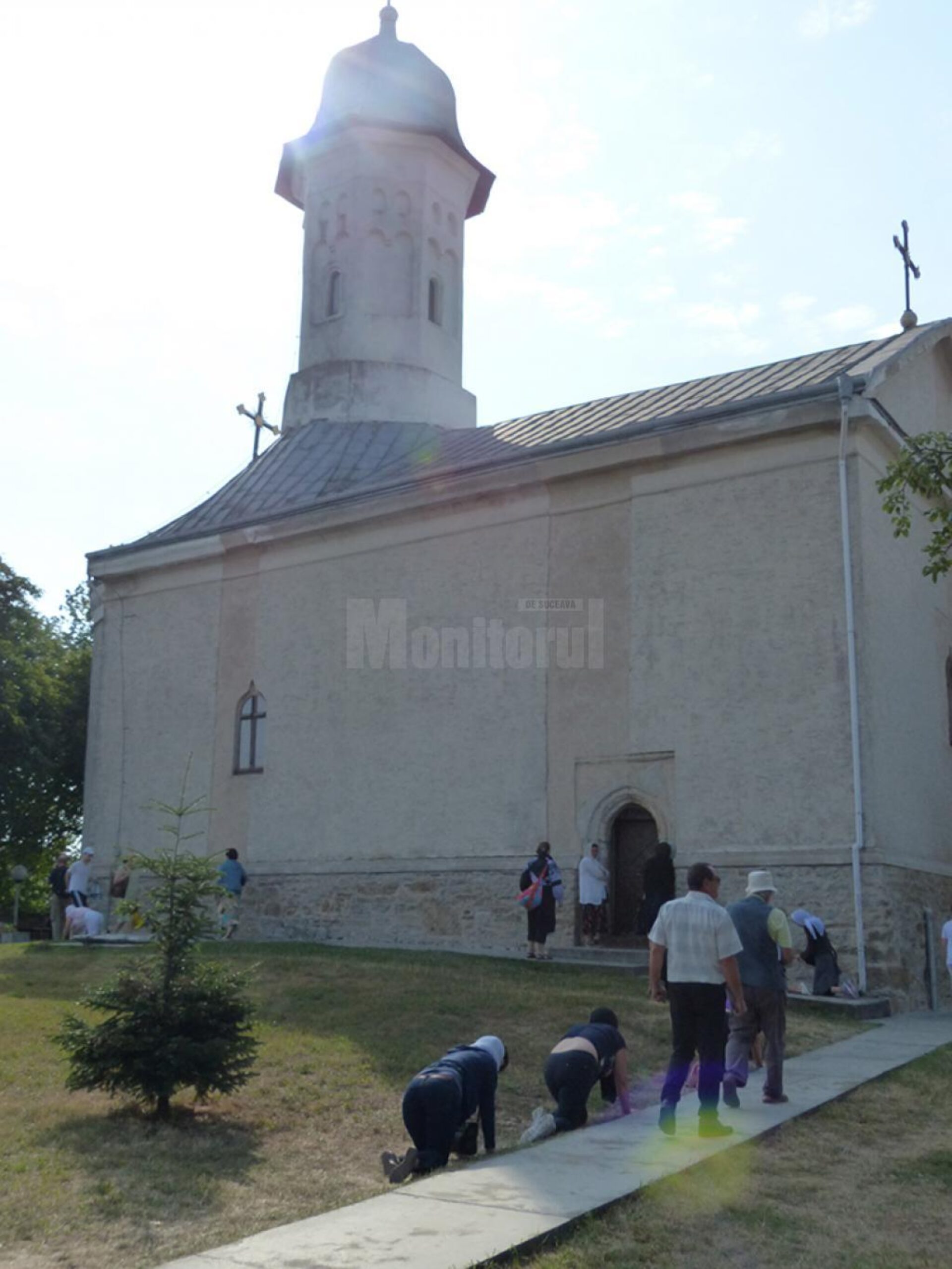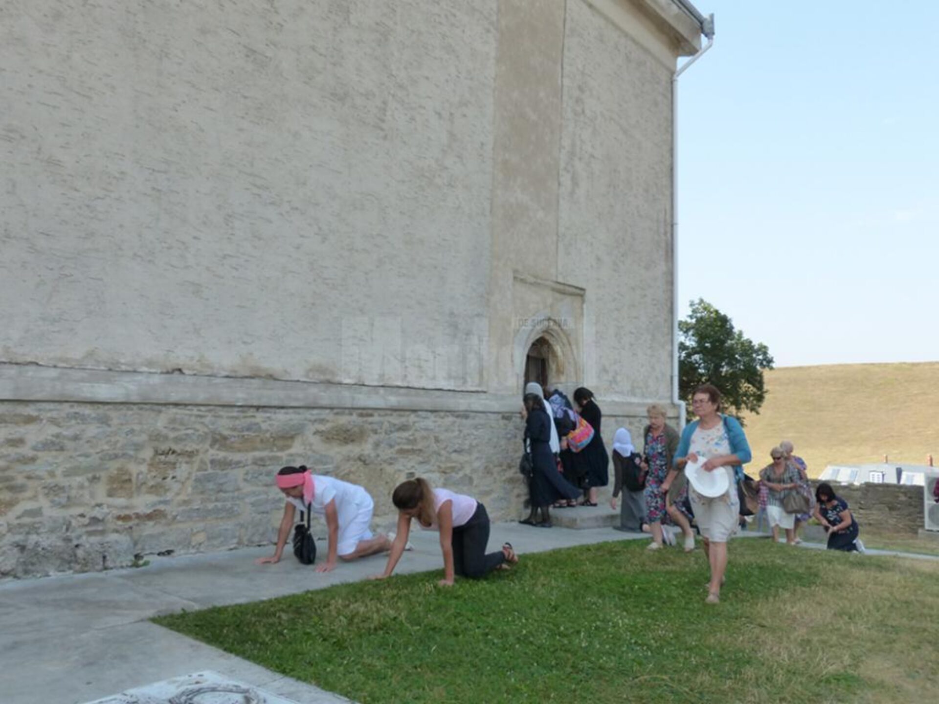 Unii dintre credincioșii prezenți duminică au respectat întocmai tradiția, urcând în genunchi dealul lăcașului de cult, din loc în loc aprinzând lumânări și punând câte o monedă, după care au înconjurat, tot în genunchi, biserica pentru ca dorințele lor să se îndeplinească.