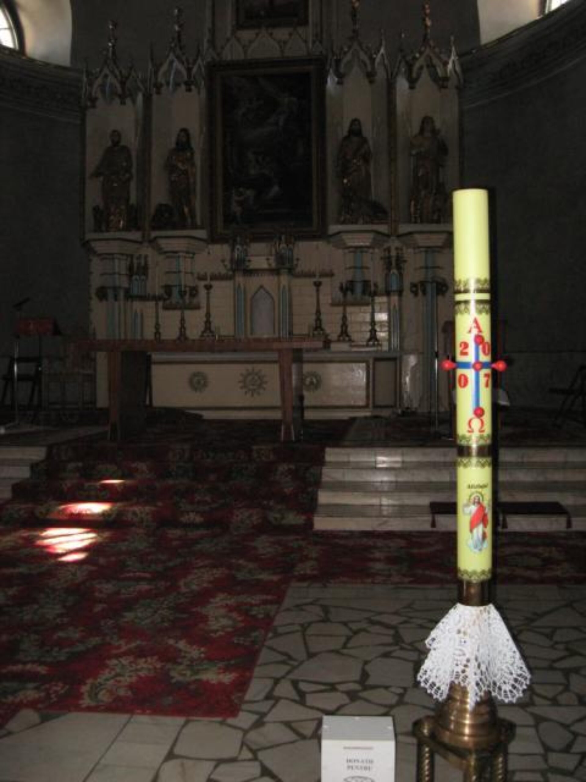 Aceasta este confecționată special, în fiecare an, având inscripționată imaginea Învierii, semnele grecești, Alfa și Omega, „Eu sunt Alfa și Omega”, adică începutul și sfârșitul, și este trecut anul 2008. Lumânarea Pascală va sta în biserică tot timpul anului, și este aprinsă mai ales la slujbele ce se oficiază pentru cei răposați.