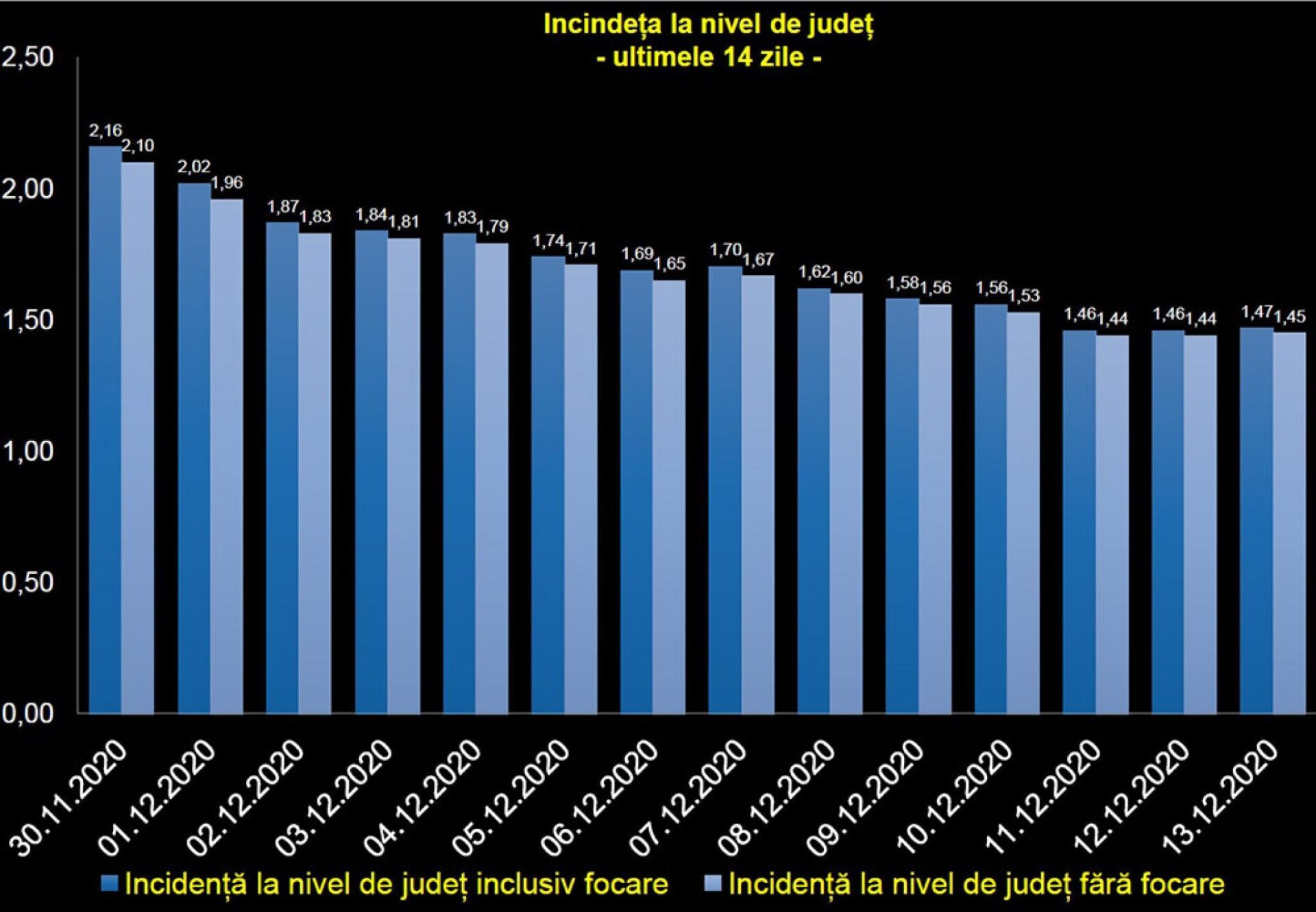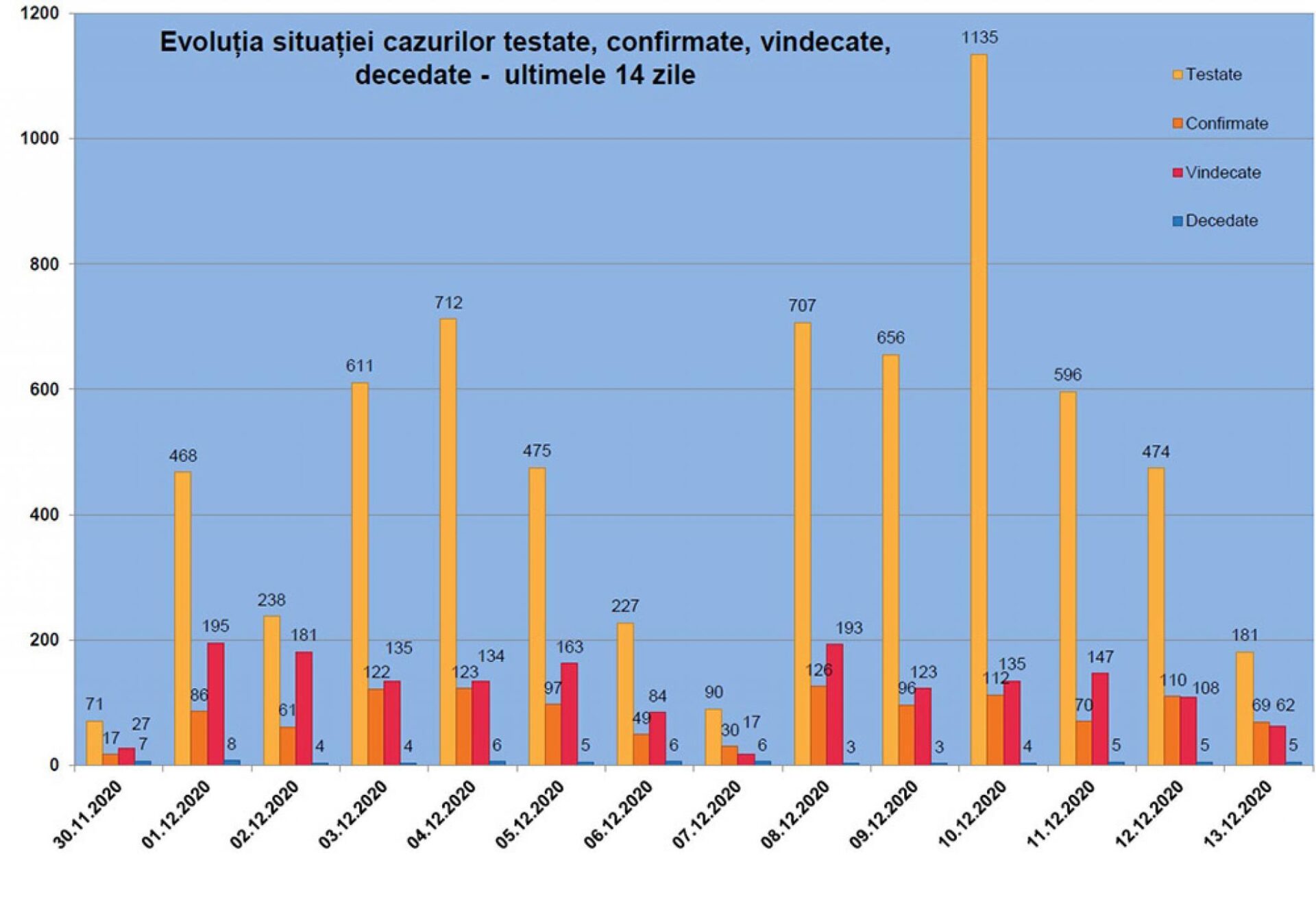 Până duminică, 13.385 de persoane diagnosticate cu infecție cu SARS-CoV-2 au decedat la nivel național. În intervalul 12-13 decembrie, au fost raportate 121 decese, 74 bărbați și 47 femei, ale unor pacienți infectați cu noul coronavirus, internați în spitalele din Alba, Arad, Argeș, Bacău, Bihor, Bistrița-Năsăud, Brăila, Brașov, Botoșani, Călărași, Caraș-Severin, Cluj, Constanța, Dâmbovița, Galați, Gorj, Hunedoara, Ialomița, Iași, Maramureș, Mureș, Olt, Prahova, Satu Mare, Sibiu, Suceava, Timiș, Vaslui, Vâlcea și municipiul București.