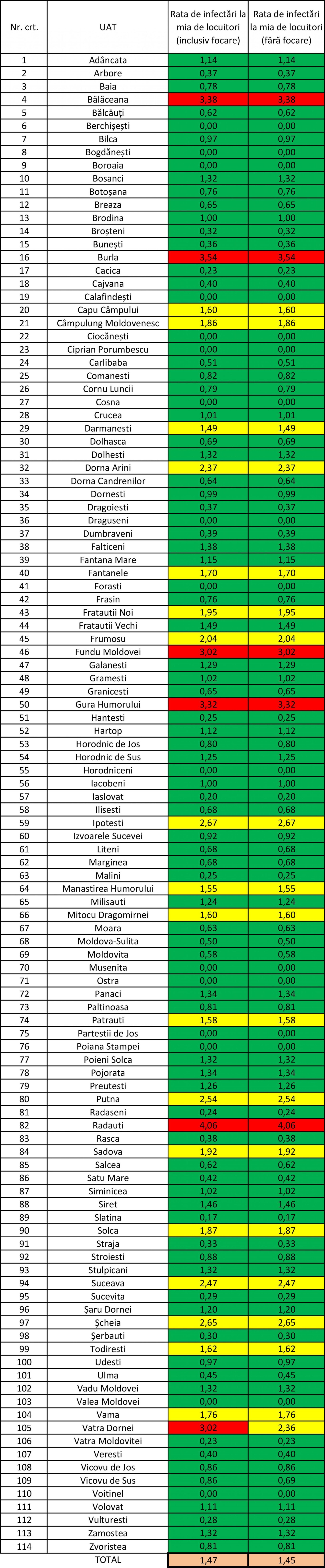 În cursul zilei de duminică, cinci localități din județul Suceava se aflau în scenariul roșu, cu o rată de infectare mai mare de 3 cazuri de coronavirus la mia de locuitori. Sâmbătă erau patru localități în care incidența cazurilor era mai mare de 3, fără a se lua în considerare focarele.