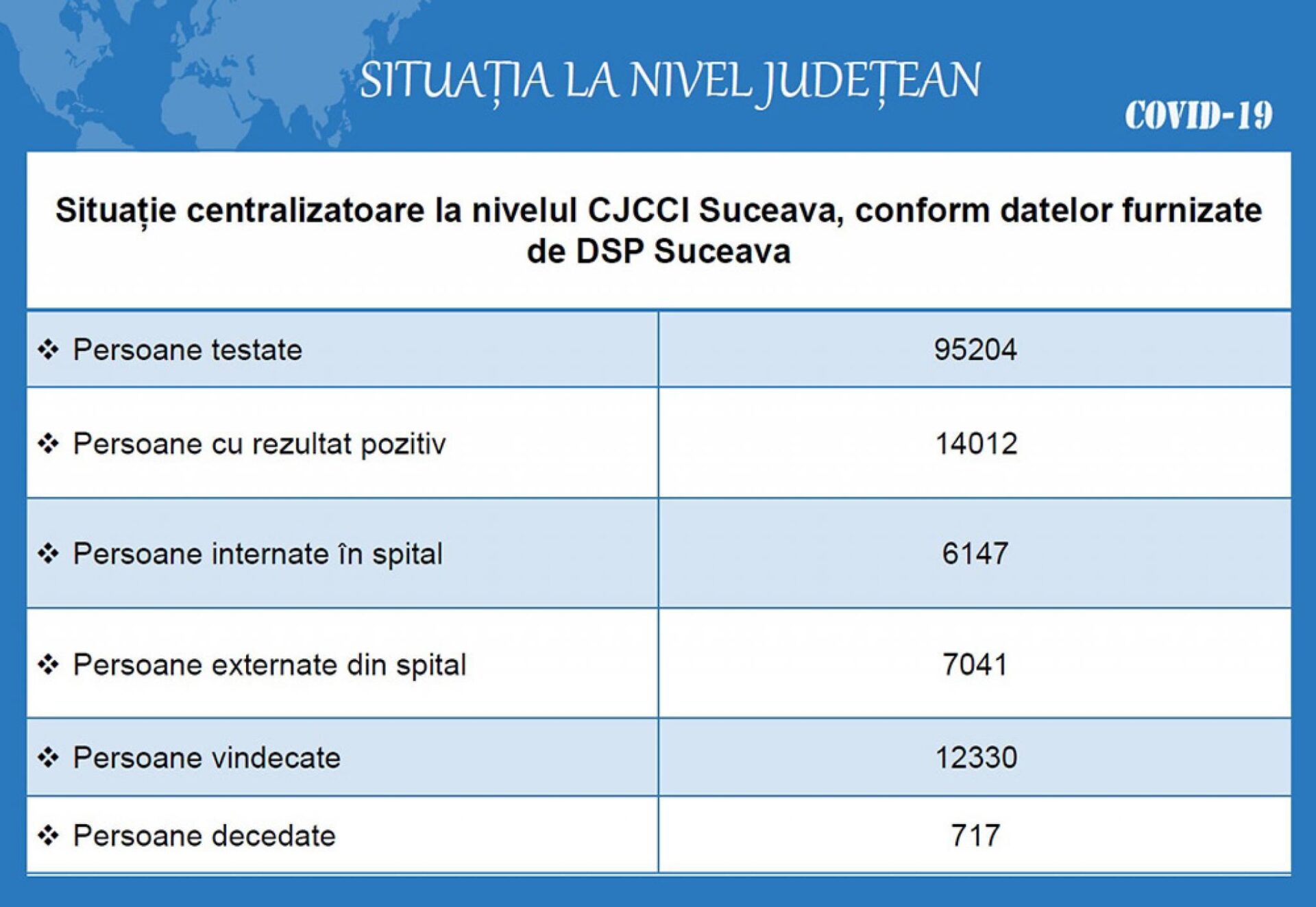 Până în momentul de față, de la începutul pandemiei, 717 persoane din județul Suceava au murit după ce s-au infectat cu noul coronavirus.