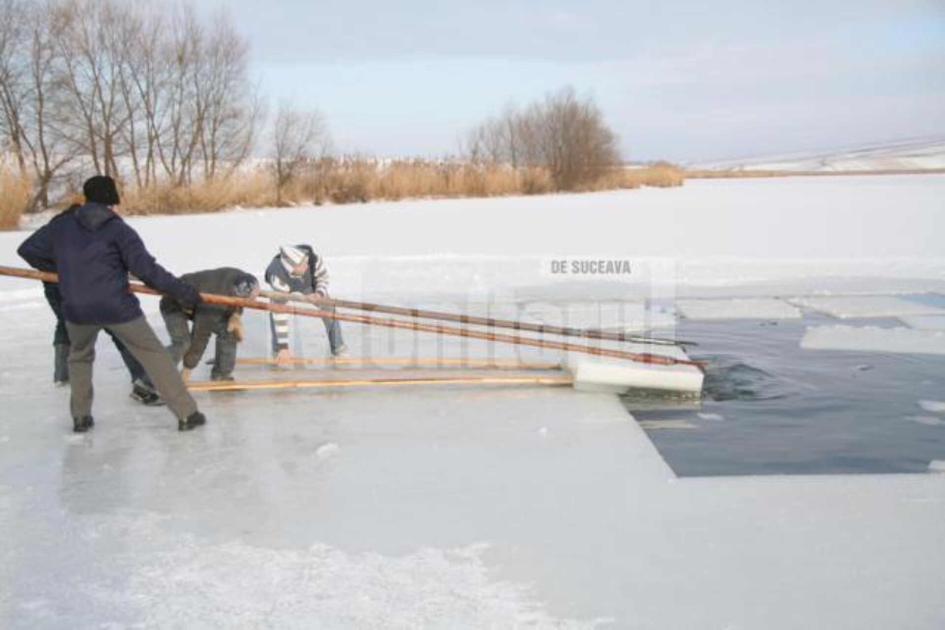 Dacă în trecut, pompierii tăiau gheața cu ferăstrăul, astăzi ei folosesc drujba pentru a putea să decupeze mai ușor blocurile de gheață din iaz.