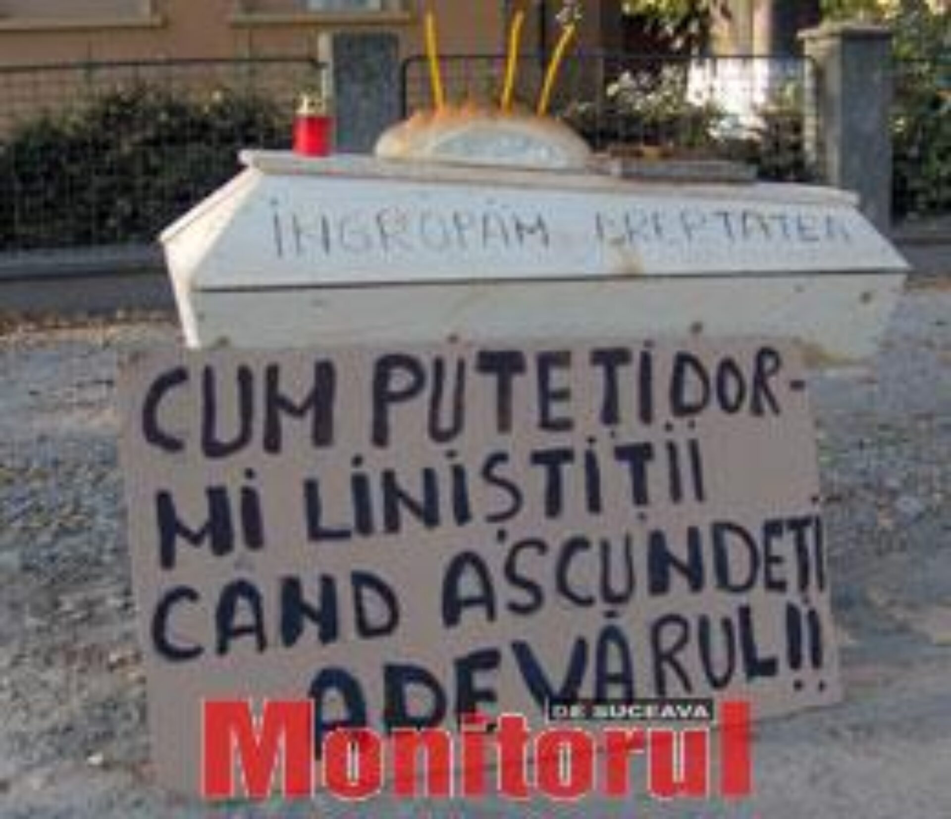 Sprijinite pe butuci, de-a lungul trotuarului din fața Judecătoriei municipiului Câmpulung Moldovenesc, cruci, steaguri negre, suporturi pentru covrigi și lumânări, cartoane inscripționate și chiar un sicriu mic au uimit trecătorii în dimineața de 25 septembrie. Protestatarii, care ne-au declarat că au organizat o „îngropăciune a dreptății”, erau doar doi, Emil și Manole Sandiuc, dar ne-au precizat că protestului urmează să i se alăture și alți frați ai lor, inclusiv o soră venită tocmai de la Hunedoara. La câțiva pași, jandarmii se uitau și ei ca la spectacol, dar atenți ca nu cumva spiritele să se încingă. Trecătorii își făceau cruce și iuțeau pasul. În incinta Judecătoriei începuseră netulburate procesele.