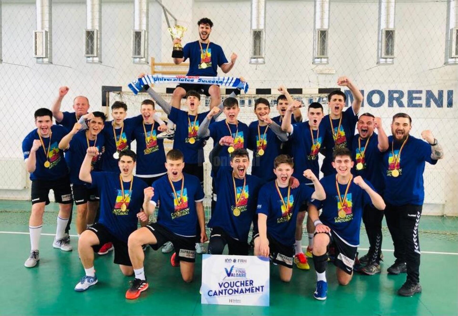 Clubul Sportiv Universitar a obținut duminică un nou rezultat de prestigiu pentru handbalul sucevean. Echipa de juniori II antrenată de Ioan Tcaciuc și Vasile Boca a izbutit să cucerească titlul de campioană a României după ce s-a impus în meciul decisiv al turneului final de la Moreni cu scorul de 38-32 (18-15), în confruntarea cu CSM București. După un început mai bun de partidă al bucureștenilor, sucevenii au revenit ușor, ușor în joc. Au reușit să egaleze pe tabela de marcaj la jumătatea primei reprize, după care s-au instalat hotărât la timona meciului, ajungând să conducă cu o diferență maximă de 9 goluri (35-26), în minutul 55.