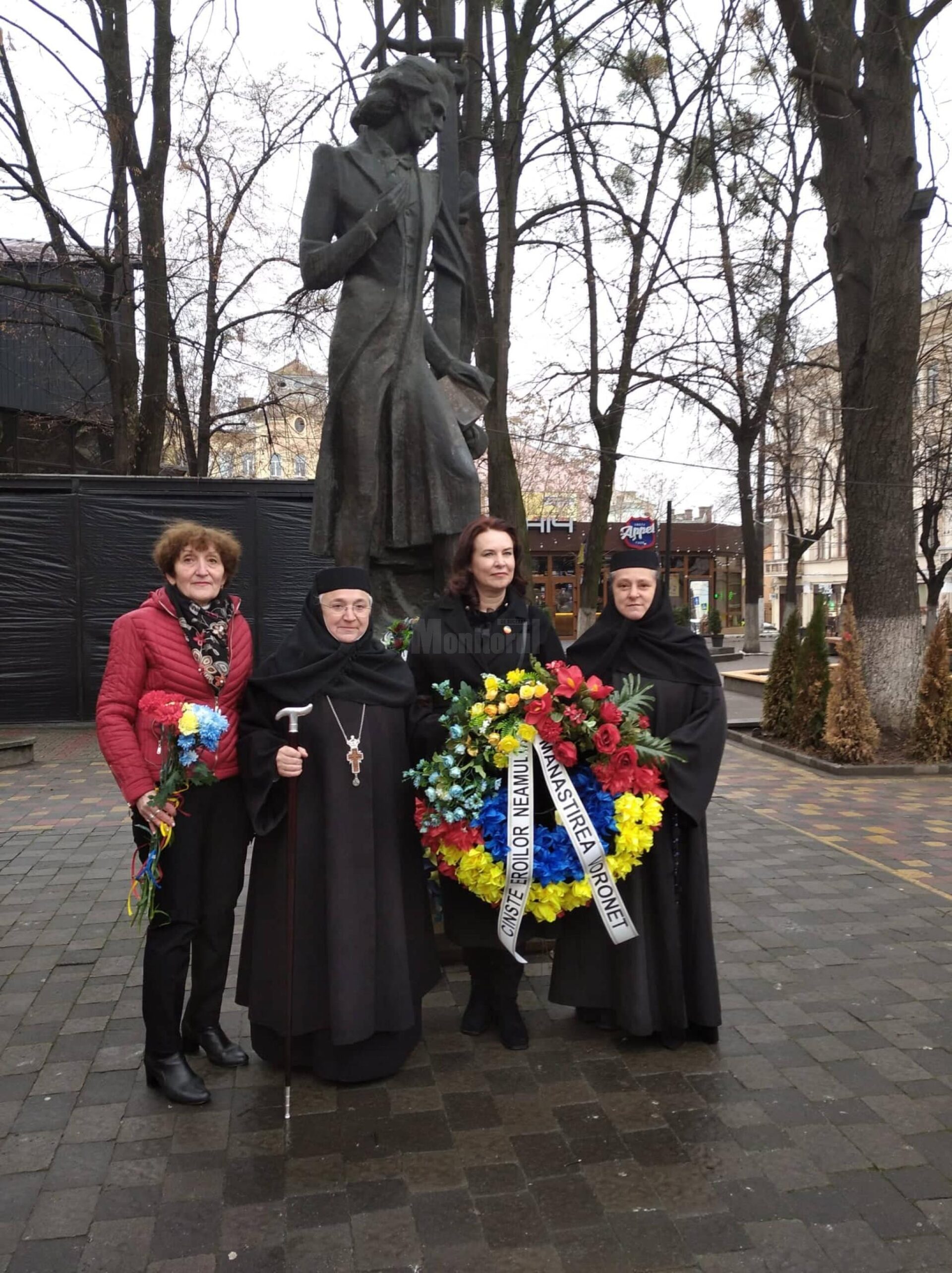 La noi primul drum, la toate sărbătorile, e spre Eminescu. La statuia Poetului ne întâlnim frate cu frate, așa ca și la acest 30 noiembrie din preajma Zilei Naționale a României, când ne-am revăzut cu stareța Sf. Mănăstiri Voroneț, stavrofora Gabriela Platon, cu directorul Bibliotecii Universității ”Ștefan cel Mare” din Suceava, dr. Sanda-Maria Ardeleanu, cu parlamentarul Florin Pușcașu, bucureșteanul cu rădăcini bucovinene Dan Filimon și alți prieteni ai românilor cernăuțeni. În spiritul tradiției încetățenite de primii diplomați români la Cernăuți, drumul de flori s-a așternut și spre statuia lui Taras Șevcenko, unde au fost aprinse lumânări în memoria eroilor care și-au jertfit viața pentru suveranitatea Ucrainei.